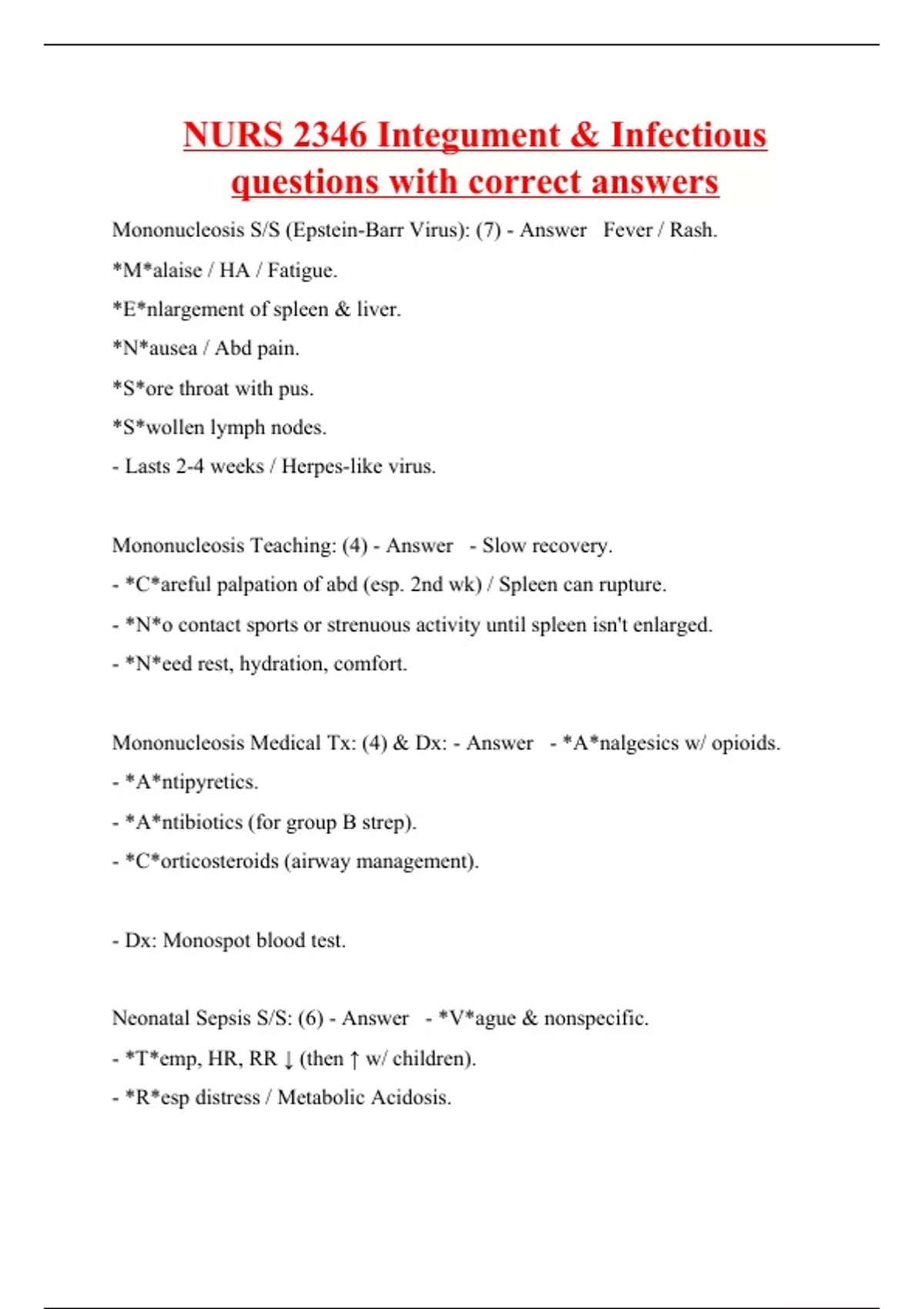 Mononucleosis S/S (Epstein-Barr Virus): (7) - Answer Fever / Rash. *M*alaise / HA / Fatigue. *E*nlargement of spleen & liver. *N*ausea / Abd pain. *S*ore throat with pus. *S*wollen lymph nodes. - Lasts 2-4 weeks / Herpes-like virus. Mononucleosis Teaching: (4) - Answer - Slow recovery. - *C*areful palpation of abd (esp. 2nd wk) / Spleen can rupture. - *N*o contact sports or strenuous activity until spleen isn't enlarged. - *N*eed rest, hydration, comfort. Mononucleosis Medical Tx: (4) & Dx: - Answer - *A*nalgesics w/ opioids. - *A*ntipyretics. - *A*ntibiotics (for group B strep). - *C*orticosteroids (airway management). - Dx: Monospot blood test. Neonatal Sepsis S/S: (6) - Answer - *V*ague & nonspecific. - *T*emp, HR, RR ↓ (then ↑ w/ children). - *R*esp distress / Metabolic Acidosis.