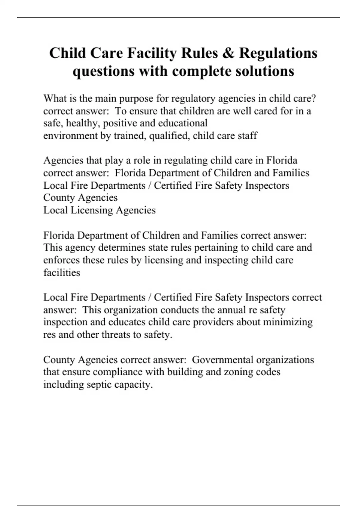 What is the main purpose for regulatory agencies in child care? correct answer: To ensure that children are well cared for in a safe, healthy, positive and educational environment by trained, qualified, child care staff Agencies that play a role in regulating child care in Florida correct answer: Florida Department of Children and Families Local Fire Departments / Certified Fire Safety Inspectors County Agencies Local Licensing Agencies Florida Department of Children and Families correct answer: This agency determines state rules pertaining to child care and enforces these rules by licensing and inspecting child care facilities Local Fire Departments / Certified Fire Safety Inspectors correct answer: This organization conducts the annual re safety inspection and educates child care providers about minimizing res and other threats to safety. County Agencies correct answer: Governmental organizations that ensure compliance with building and zoning codes including septic capacity. Local Licensing Agencies correct answer: These organizations, found in some counties, regulate
