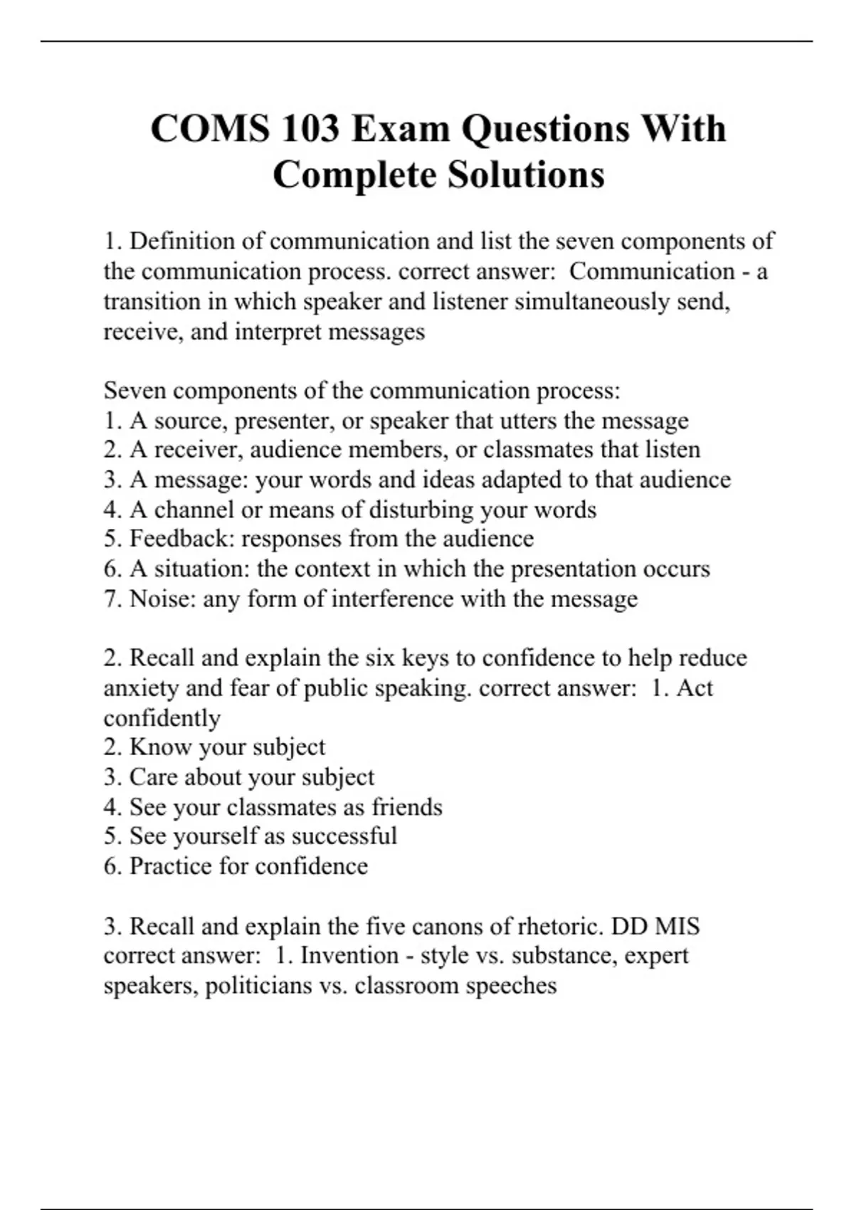 1. Definition of communication and list the seven components of the communication process. correct answer: Communication - a transition in which speaker and listener simultaneously send, receive, and interpret messages Seven components of the communication process: 1. A source, presenter, or speaker that utters the message 2. A receiver, audience members, or classmates that listen 3. A message: your words and ideas adapted to that audience 4. A channel or means of disturbing your words 5. Feedback: responses from the audience 6. A situation: the context in which the presentation occurs 7. Noise: any form of interference with the message 2. Recall and explain the six keys to confidence to help reduce anxiety and fear of public speaking. correct answer: 1. Act confidently 2. Know your subject 3. Care about your subject 4. See your classmates as friends 5. See yourself as successful 6. Practice for confidence 3. Recall and explain the five canons of rhetoric. DD MIS correct answer: 1. Invention - style vs. substance, expert speakers, politicians vs. classroom speeches 2. Disposition/Arrangement - structure of t