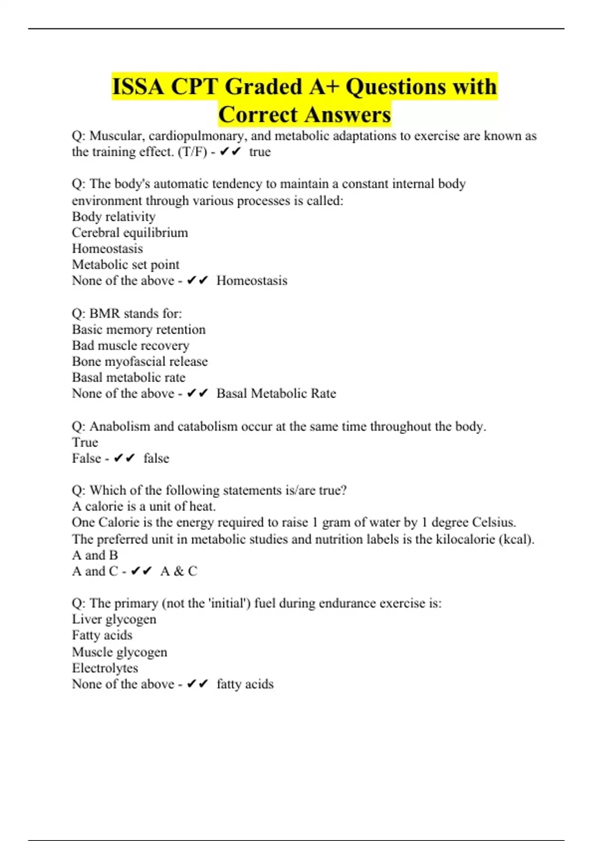 Q: Muscular, cardiopulmonary, and metabolic adaptations to exercise are known as the training effect. (T/F) - true Q: The body's automatic tendency to maintain a constant internal body environment through various processes is called: Body relativity Cerebral equilibrium Homeostasis Metabolic set point None of the above - Homeostasis Q: BMR stands for: Basic memory retention Bad muscle recovery Bone myofascial release Basal metabolic rate None of the above - Basal Metabolic Rate Q: Anabolism and catabolism occur at the same time throughout the body. True False - false Q: Which of the following statements is/are true? A calorie is a unit of heat. One Calorie is the energy required to raise 1 gram of water by 1 degree Celsius. The preferred unit in metabolic studies and nutrition labels is the kilocalorie (kcal). A and B A and C - A & C Q: The primary (not the 'initial') fuel during endurance exercise is: Liver glycogen Fatty acids Muscle glycogen Electrolytes None of the above - fatty acids Q: The molecule used for storing and transferring energy in the body is called: Micronutrients Carbohydrates Carbon dioxide (CO2) Adenosine triphosphate (ATP) None of the above - Adenosine triphosphate Q: The ATP/CP pathway is the primary pathway used for activities lasting two minutes or greater. True False - false Q: About 98% of the human body is composed of only six elements: oxygen, carbon, hydrogen, nitrogen, calcium, and phosphorous. True False - true Q: The respiratory system is responsible for: Supplying oxygen to the body Eliminating carbon dioxide in the body Helps regulate the body's pH balance A and B A, B, and C - a, b & c Q: The circulatory system consists of: Lungs, mouth, throat, trachea, and bronchi Mouth esophagus, stomach, and gallbladder Heart, arteries, and veins All of the above None of the above - heart arteries and veins Q: The nervous system is made up of the: Peripheral nervous system Central nervous system Proximal nervous system A and B A and C - a & b Q: Excretion is one function of the digestive system. True False - true Q: Hormones are classified as: Steroids Amino acid derivatives Peptides All of the above None of the above - all of the above Q: Hemoglobin is an oxygen-transporting protein in red blood cells. True False - true Q: The main purpose(s) of hormones is/are to: Alter the rate of synthesis of your cellular protein Change the rate of enzyme activity Change the rate of transport of nutrients through the cell wall All of the above None of the above - all of the above Q: Tendons connect bone to bone. True False - false Q: The average human adult skeleton has: 80 bones 126 bones 206 bones Over 400 bones None of the above - 206 bones Q: Tendons: Are extensions of muscle fibers Connect bone to bone Connect muscle to bone A and B A and C - a and c Q: The anatomical terms for front and back are: Superior and inferior Proximal and distal Anterior and posterior Lateral and medial None of the above - anterior and posterior