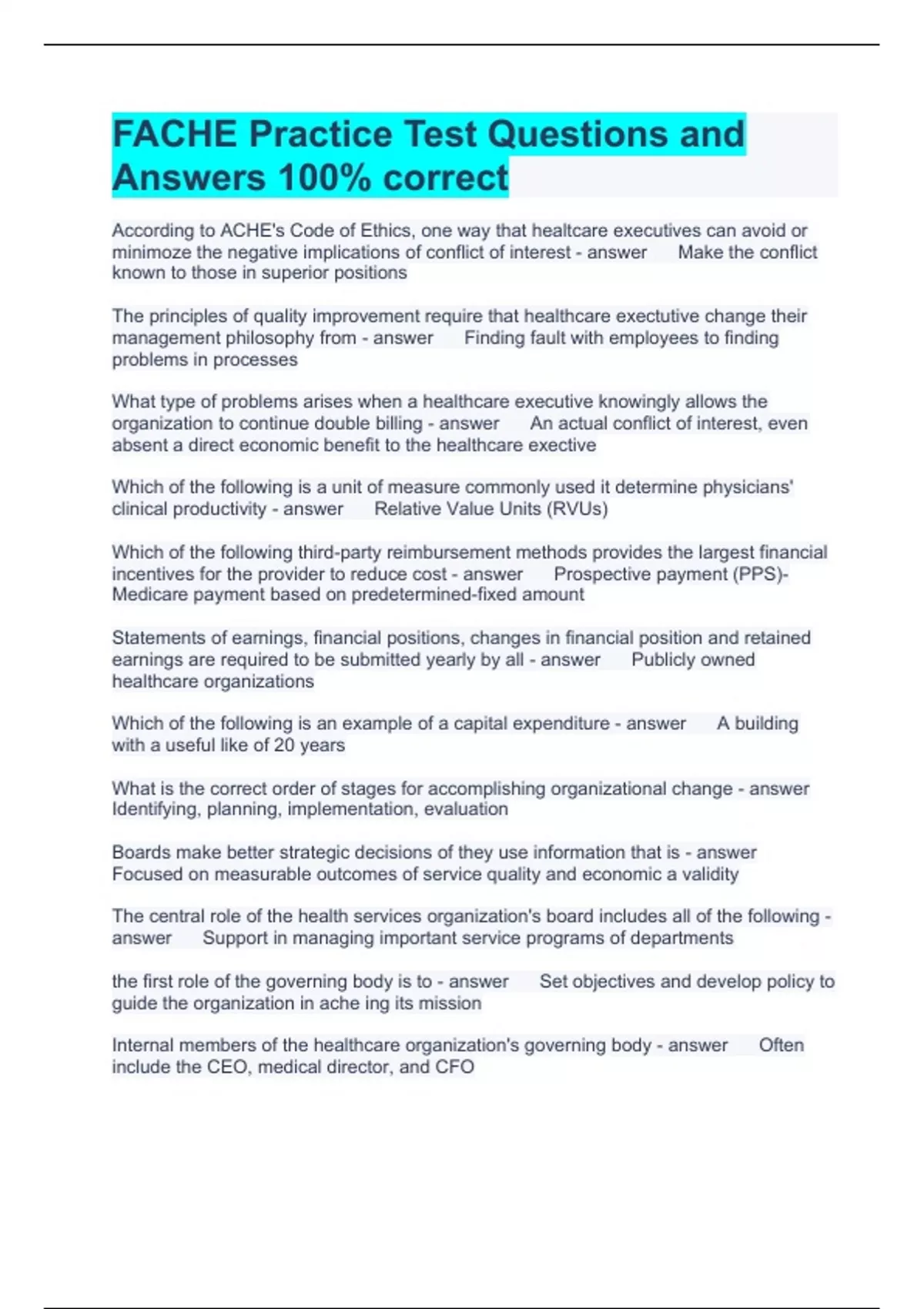 FACHE Practice Test Questions and Answers 100% correct According to ACHE's Code of Ethics, one way that healtcare executives can avoid or minimoze the negative implications of conflict of interest Make the conflict known to those in superior positions The principles of quality improvement require that healthcare exectutive change their management philosophy from Finding fault with employees to finding problems in processes What type of problems arises when a healthcare executive knowingly allows the organization to continue double billing An actual conflict of interest, even absent a direct economic benefit to the healthcare exective Which of the following is a unit of measure commonly used it determine physicians' clinical productivity Relative Value Units (RVUs) Which of the following third-party reimbursement methods provides the largest financial incentives for the provider to reduce cost Prospective payment (PPS)-Medicare payment based on predetermined-fixed amount Statements of earnings, financial positions, changes in financial position and retained earnings are required to be submitted yearly by all Publicly owned healthcare organizations Which of the following is an example of a capital expenditure A building with a useful like of 20 years What is the correct order of stages for accomplishing organizational change Identifying, planning, implementation, evaluation Boards make better strategic decisions of they use information that is Focused on measurable outcomes of service quality and economic a validity The central role of the health services organization's board includes all of the following Support in managing important service programs of departments the first role of the governing body is to Set objectives and develop policy to guide the organization in ache ing its mission Internal members of the healthcare organization's governing body Often include the CEO, medical director, and CFO In assessing the advantage of using a focus group over a survey in evaluating a program, one could say that focus groups: Are more useful in designing improvements to a program From a marketing viewpoint, the development of standards of practice, clinical pathways, clinical guidelines and protocols can all be viewed as efforts to deal with which unique aspect of delivering services Heterogeneity What purpose do market plans fulfill for the healthcare organization Provide specific objectives for utilization attainment the next fiscal year The five functions of marketing are Identifying markets, promoting the organization, managing external relationship, convincing patients to select the organization, attracting capable workers Forecasting organizational need for human resources by focusing on specific position openings that are likely to occur and using these for planning called Demand-pull approach A health services organization should use which of the following sequential processes to help establish human resources objectives and policies Analyze the current HR situation, forecast HR demand, reconcile with the budget, forecast supply Probability models that forecast the internal flow of employees from one job category to another use a Transition matrix--model internal flow of HR-historical movement of one job to another Forecasting the internal supply of employees as they move from their current jobs into others through promotions, lateral move and termination is called Supply-push approach Which of the following describes the conflict management strategy that would have the most immediate effect on reducing conflict behavio Imposition of formal authority to resolve or suppress conflict Multi-rather assessment (360 degrees feedback) of managers in healthcare organization's is best used In the development of a specific action plan by appraises Behaviorally anchored rating scales (BARS) for specific jobs can be Used to identify component of job behaviors In the amount of charity care increased rom one reporting period to the next, which of the following would occur Unrestricted net assets would decrease Which would be a reasonable basis on which to allocate administrative overhead cost Amount of supplies used The effective cost of debt is roughly the same for both not-for-profit and investor-owned organization's becasue The tax deductibility of interest for investor-owned firms offsets the lower coupon rate on tax-exempt debt The master site plan (or master facility plan) for healthcare organization Describes future facility needs(either renovation or new construction) necessary to meet strategic and operational needs Which of the following statements best describes the statistics bedget It provides input date for other budgets All areas of healthcare facilities are subject to safety, convenience and other regulatory requirements as dictated by the state like safety codes, JCAHO, OSHA, state fire marshal, etc. Which area of the facility typically has the highest standards Patient care areas The best way to reduce/contain the costs of distributing supplies throughout an organization is to Minimize the number of times an item is handled from the time it is reviewed by the organization to the time it is used The objective of maintenance and repair services is to keep the facility and its equipment operating like new. This goal is best achieved by emphasizing Prevention The facility's plan for a healthcare organization may include plans for renovation or new construction, energy requirements, acquisition of new property, financing options, etc. However, the facility plan begins with an estimate of each service or department's Operational needs An important management principle that should guide the development of information systems in healthcare organization is to Treat information as an essential organization resource Which of the following is a major priority for system development in the managed care environment Development of operational inpatient systems Which of the following is considered