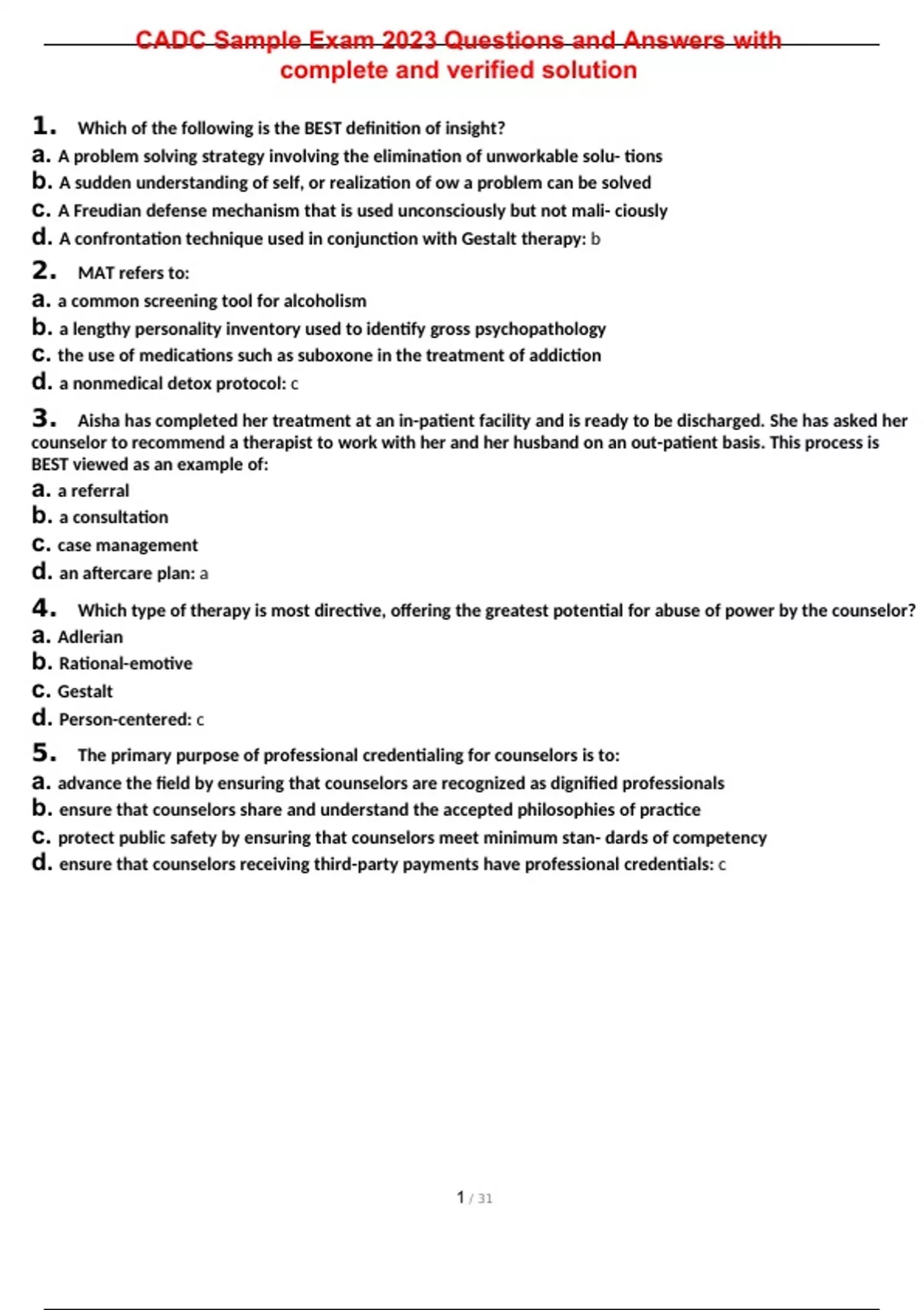 1. Which of the following is the BEST definition of insight? a. A problem solving strategy involving the elimination of unworkable solu- tions b. A sudden understanding of self, or realization of ow a problem can be solved c. A Freudian defense mechanism that is used unconsciously but not mali- ciously d. A confrontation technique used in conjunction with Gestalt therapy: b 2. MAT refers to: a. a common screening tool for alcoholism b. a lengthy personality inventory used to identify gross psychopathology c. the use of medications such as suboxone in the treatment of addiction d. a nonmedical detox protocol: c 3. Aisha has completed her treatment at an in-patient facility and is ready to be discharged. She has asked her counselor to recommend a therapist to work with her and her husband on an out-patient basis. This process is BEST viewed as an example of: a. a referral b. a consultation c. case management d. an aftercare plan: a 4. Which type of therapy is most directive, offering the greatest potential for abuse of power by the counselor? a. Adlerian b. Rational-emotive c. Gestalt d. Person-centered: c 5. The primary purpose of professional credentialing for counselors is to: a. advance the field by ensuring that counselors are recognized as dignified professionals b. ensure that counselors share and understand the accepted philosophies of practice c. protect public safety by ensuring that counselors meet minimum stan- dards of competency d. ensure that counselors receiving third-party payments have professional credentials: c 6. Which of the following is NOT a CNS depressant? a. Alcohol b. Xanax c. Nembutal d. Benzedrine: d 7. The concept of informed consent requires that before agreeing to ac- cept treatment, clients should know their rights and obligations, therapeutic goals, fees for services and a. availability of referral services b. community resources to be used c. with whom they will be participating in group activities d. the limits of their confidentiality: d 8. Attitudes, policies, and practices that are destructive to other cultures and their members are examples of lack of cultural a. blindness b. competence c. destructiveness d. incapacity: b 9. Restlessness, nervousness, flushed face, muscle twitching, tachycardia, or cardiac arrhythmia are all signs or symptoms of: a. caffeine intoxication b. cocaine intoxication c. alcohol intoxication d. opioid intoxication: a 10. Of all of the possible substance use disorders, which one is typically not seen in older children or adults? a. cannabis use disorder b. inhalant use disorder c. tobacco use disorder d. caffeine use disorder: b 11. Needle exchange programs can BEST be described as: a. a nonabstinence technique b. harm reduction c a maintenance method d. a community organization intervention: b 12. Autonomic hyperactivity, hand tremor, nausea or vomiting, psychomotor agitation, grand mal seizures are all signs or symptoms of: