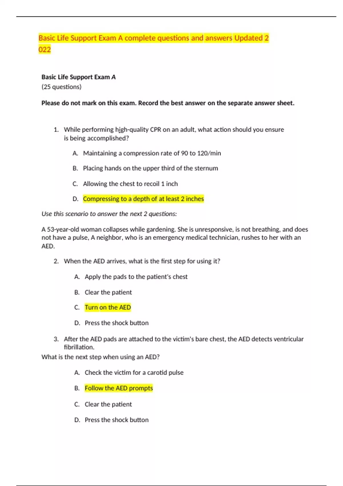 asic Life Support Exam A (25 Questions with Answers) Updated 2022 Please do not mark on this exam. Record the best answer on the separate answer sheet. 1) While performing high-quality CPR on an adult, what action should you ensure is being accomplished? A. Maintaining a compression rate of 90 to 120/min B. Placing hands on the upper third of the sternum C. Allowing the chest to recoil 1 inch D. Compressing to a depth of at least 2 inches Use this scenario to answer the next 2 questions: A 53-year-old woman collapses while gardening. She is unresponsive, is not breathing, and does not have a pulse, A neighbor, who is an emergency medical technician, rushes to her with an AED.