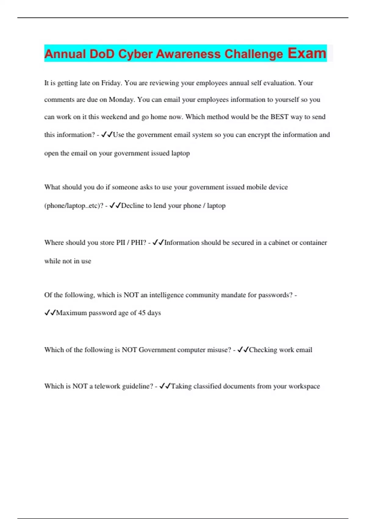 It is getting late on Friday. You are reviewing your employees annual self evaluation. Your comments are due on Monday. You can email your employees information to yourself so you can work on it this weekend and go home now. Which method would be the BEST way to send this information? - Use the government email system so you can encrypt the information and open the email on your government issued laptop What should you do if someone asks to use your government issued mobile device (phone/laptop..etc)? - Decline to lend your phone / laptop Where should you store PII / PHI? - Information should be secured in a cabinet or container while not in use Of the following, which is NOT an intelligence community mandate for passwords? - Maximum password age of 45 days Which of the following is NOT Government computer misuse? - Checking work email