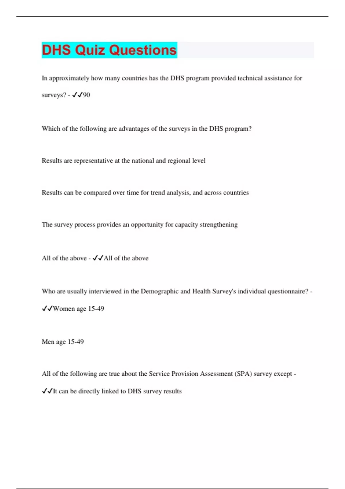In approximately how many countries has the DHS program provided technical assistance for surveys? - 90 Which of the following are advantages of the surveys in the DHS program? Results are representative at the national and regional level Results can be compared over time for trend analysis, and across countries The survey process provides an opportunity for capacity strengthening All of the above - All of the above Who are usually interviewed in the Demographic and Health Survey's individual questionnaire? - Women age 15-49