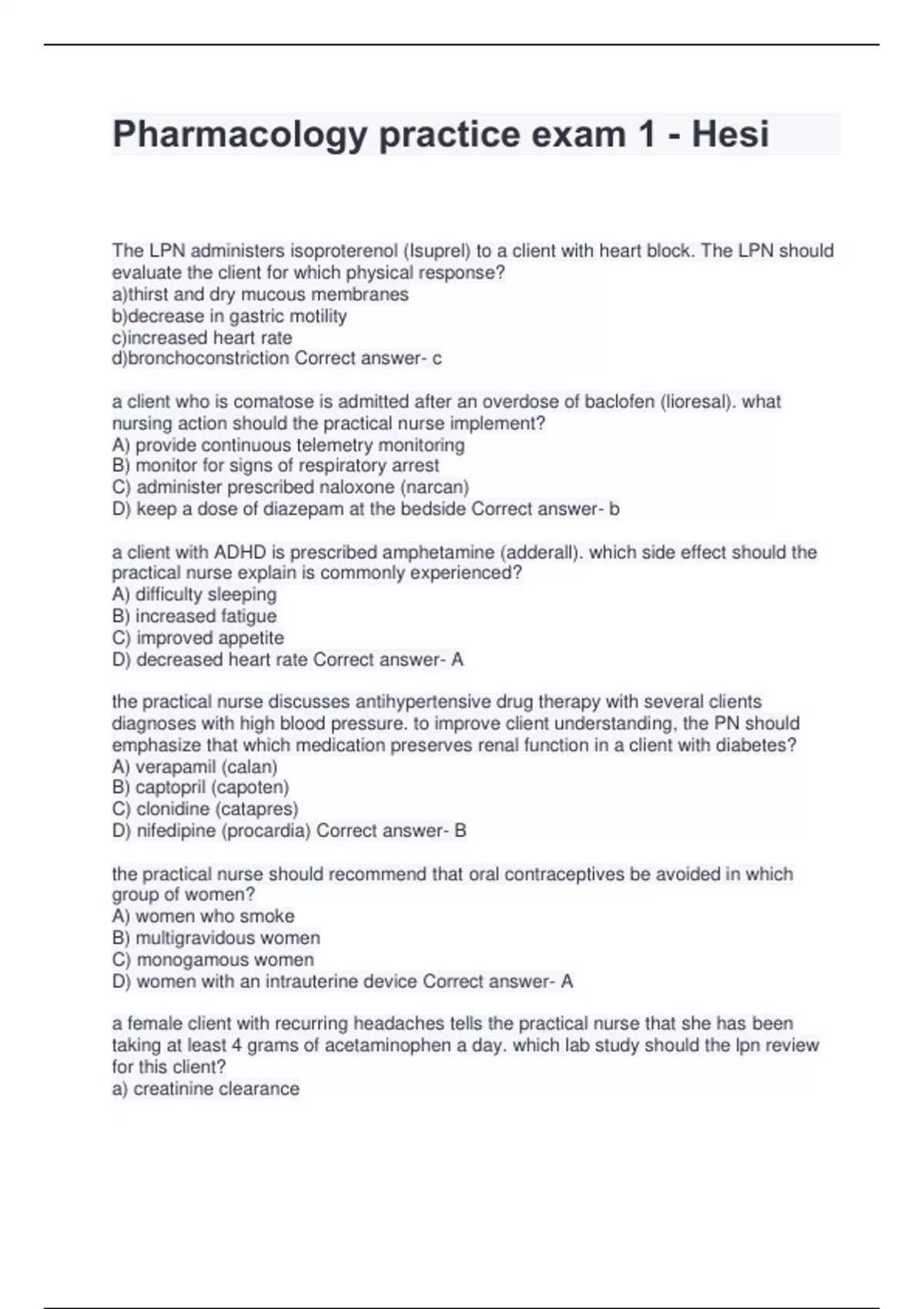 Pharmacology practice exam 1 - Hesi The LPN administers isoproterenol (Isuprel) to a client with heart block. The LPN should evaluate the client for which physical response? a)thirst and dry mucous membranes b)decrease in gastric motility c)increased heart rate d)bronchoconstriction Correct answer- c a client who is comatose is admitted after an overdose of baclofen (lioresal). what nursing action should the practical nurse implement? A) provide continuous telemetry monitoring B) monitor for signs of respiratory arrest C) administer prescribed naloxone (narcan) D) keep a dose of diazepam at the bedside Correct answer- b a client with ADHD is prescribed amphetamine (adderall). which side effect should the practical nurse explain is commonly experienced? A) difficulty sleeping B) increased fatigue C) improved appetite D) decreased heart rate Correct answer- A