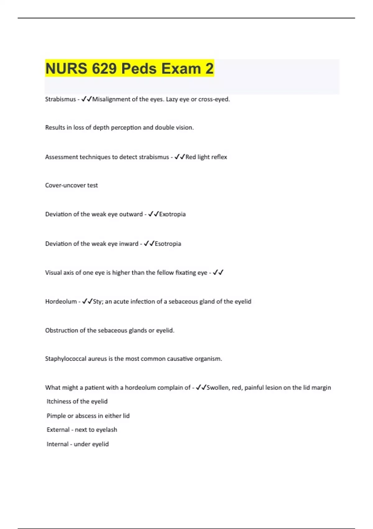 Strabismus - Misalignment of the eyes. Lazy eye or cross-eyed. Results in loss of depth perception and double vision. Assessment techniques to detect strabismus - Red light reflex Cover-uncover test Deviation of the weak eye outward - Exotropia Deviation of the weak eye inward - Esotropia Visual axis of one eye is higher than the fellow fixating eye - Hordeolum - Sty; an acute infection of a sebaceous gland of the eyelid Obstruction of the sebaceous glands or eyelid. Staphylococcal aureus is the most common causative organism. What might a patient with a hordeolum complain of - Swollen, red, painful lesion on the lid margin Itchiness of the eyelid Pimple or abscess in either lid External - next to eyelash Internal - under eyelid
