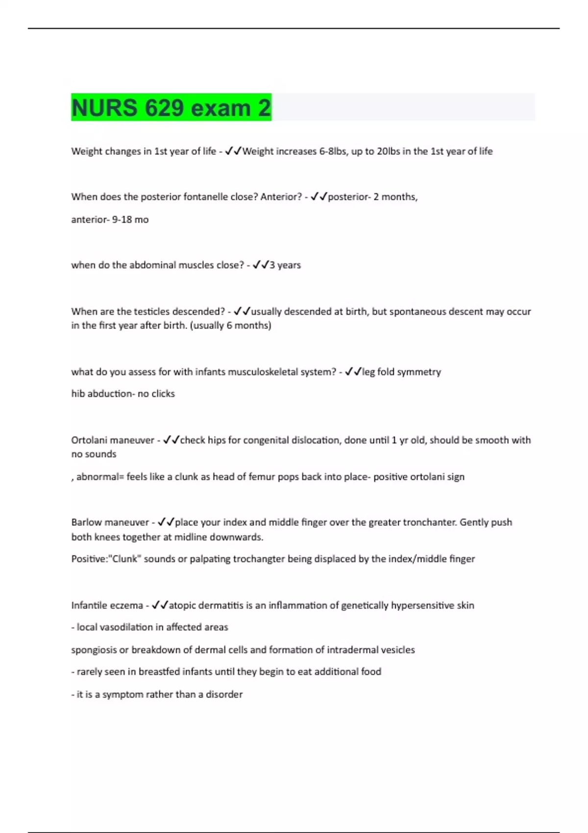 Weight changes in 1st year of life - Weight increases 6-8lbs, up to 20lbs in the 1st year of life When does the posterior fontanelle close? Anterior? - posterior- 2 months, anterior- 9-18 mo when do the abdominal muscles close? - 3 years When are the testicles descended? - usually descended at birth, but spontaneous descent may occur in the first year after birth. (usually 6 months) what do you assess for with infants musculoskeletal system? - leg fold symmetry hib abduction- no clicks Ortolani maneuver - check hips for congenital dislocation, done until 1 yr old, should be smooth with no sounds , abnormal= feels like a clunk as head of femur pops back into place- positive ortolani sign Barlow maneuver - place your index and middle finger over the greater tronchanter. Gently push both knees together at midline downwards. Positive:"Clunk" sounds or palpating trochangter being displaced by the index/middle finger Infantile eczema - atopic dermatitis is an inflammation of genetically hypersensitive skin - local vasodilation in affected areas spongiosis or breakdown of dermal cells and formation of intradermal vesicles - rarely seen in breastfed infants until they begin to eat additional food - it is a symptom rather than a disorder
