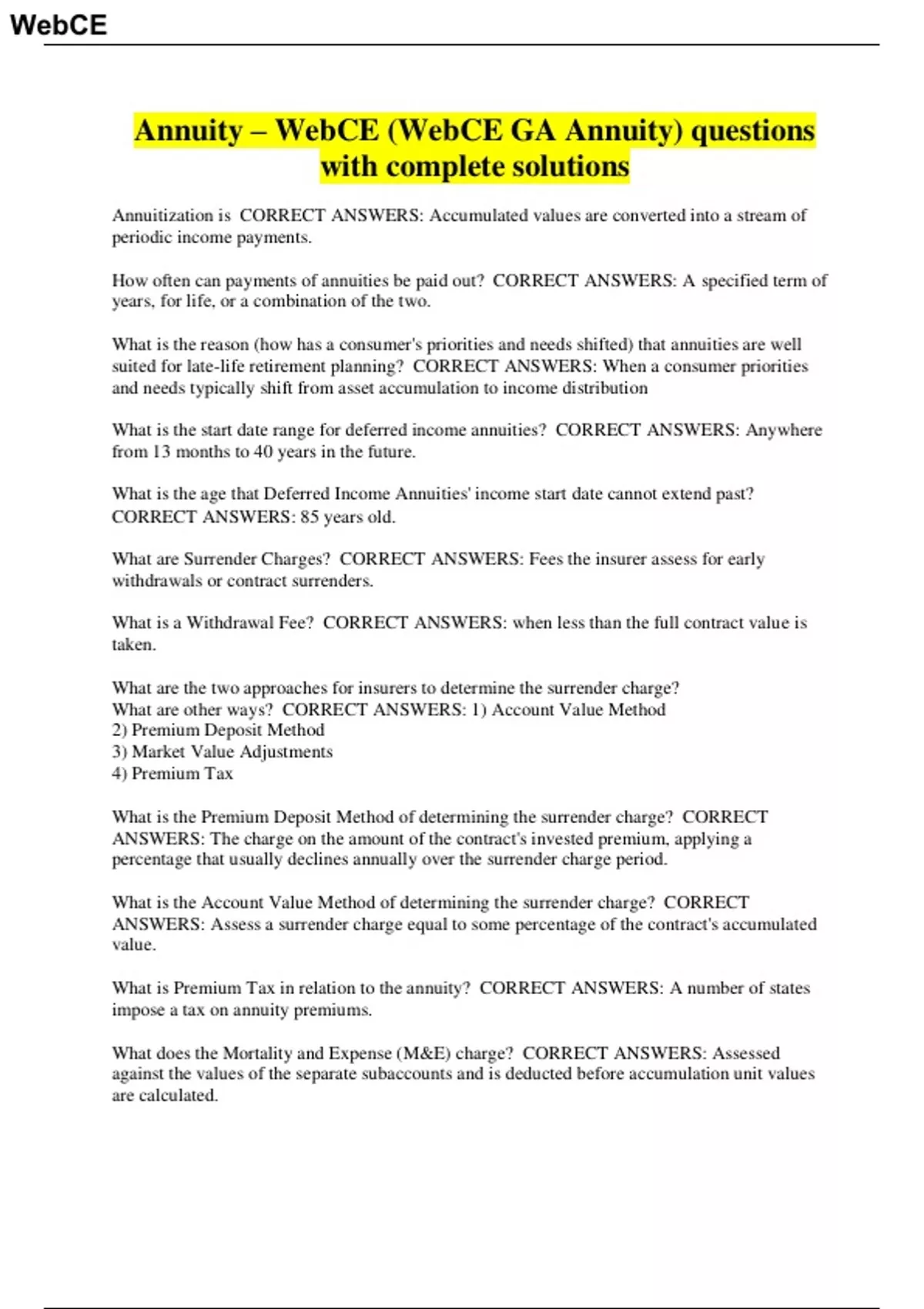 Annuity – WebCE (WebCE GA Annuity) questions with complete solutions