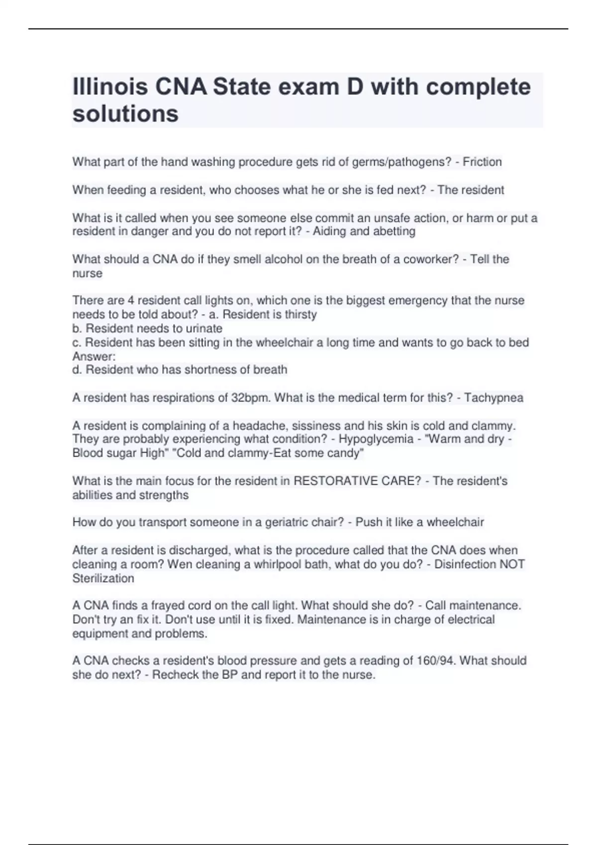 illinois cna state exam d with complete solutions