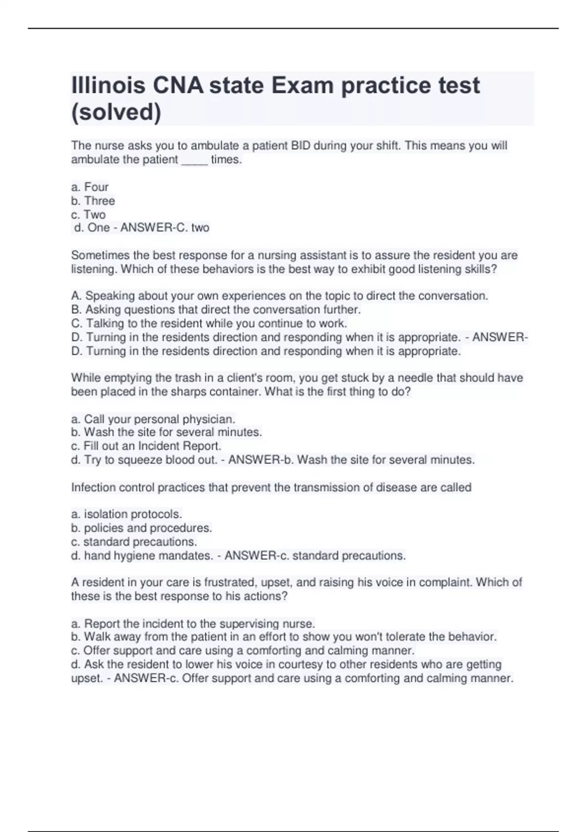 D. Turning in the residents direction and responding when it is appropriate. While emptying t he trash in a client's room, you get stuck by a needle that should have been placed in the sharps container. What is the first thing to do? a. Call your personal physician. b. Wash the site for several minutes. c. Fill out an Incident Report. d. Try to squeeze blood out. - ANSWER -b. Wash the site for several minutes. Infection control practices that prevent the transmission of disease are called a. isolation protocols. b. policies and procedures. c. standard precautions. d. hand hygiene mandates. - ANSWER -c. standard precautions. A resident in your care is frustrated, upset, and raising his voice in complaint. Which of these is the best response to his actions? a. Report the incident to the supervising nurse. b. Walk away from the patient in an eff ort to show you won't tolerate the behavior. c. Offer support and care using a comforting and calming manner. d. Ask the resident to lower his voice in courtesy to other residents who are getting upset. - ANSWER -c. Offer support and care using a comforting and calming manner. There are certain steps to follow from start to finish when beginning a procedure on a patient. As a nursing assistant, it is extremely important to start with which of these tasks? a. Enter the date in the patients medical record. b. Document what you did. c. Provide privacy in the immediate area. d. Verify the residents identification. - ANSWER -d. Verify the residents identification. As dementia progresses, incontinence can become an issue. How can the nurse aide assist? a. Avoid outings to minimize accidents and possible embarrassment. b. Remind the resident to let you know when they need to use the bathroom. c. Start to use an adult diaper to keep clothing and linens clean. d. Watch for signs of discomfort so you can take the res ident to the bathroom. - ANSWER -d. Watch for signs of discomfort so you can take the resident to the bathroom. When a patient is dying, the last of the five senses the patient loses is ____? a. Hearing b. Touch c. Taste d. Sight - ANSWER -a. Hearing If you have a resident who is completely deaf, which of these would be the most important for effective communication? a. A laptop or pen and paper. b. A loud voice that projects over noise. c. An alarm that rings louder than in non -hearing impaired rooms. d. A phone system with amplifiers. - ANSWER -a. A laptop or pen and paper. When getting dressed, a client always wants to wear her favorite outfit. What is a good solution? a. Hide the favorite outfit for a few days so she forgets. b. Tell the resident tha t the outfit is dirty and she will have to choose another. c. Ask the family to get several identical outfits. d. Explain the benefits of variety and offer several other outfits. - ANSWER -c. Ask the family to get several identical outfits. Blood -borne inf ections include a. chicken pox b. pneumonia c. hepatitis d. measles - ANSWER -c. hepatitis A resident in your care has just received news of a death in the family. What is the best way to assist them with the grieving process? a. Tell the resident about an experience you had with death and what helped you cope with it. b. Remind the resident that death is inevitable. c. Spend some time with the resident, particularly offering support if he or she wishes to talk about it. d. Suggest that the resident get his or her mind off of things by thinking of something pleasant. - ANSWER -c. Spend some time with the resident, particularly offering support if he or she wishes to talk about it. Elizabeth Kübler -Ross describes the stages of grief a person goes through w hen they lose someone close to them. She believes the first stage of the grieving process is ____. a. Acceptance b. Anger c. Depression d. Denial - ANSWER -d. Denial When you are documenting in a medical record, which of these is not part of the process? a. Author identification. b. Using correct spelling. c. Dating your entries. d. Writing in pencil so erasures can make the record clean. - ANSWER -d. Writing in pencil so erasures can make the record clean. A nurse aide finds a resident looking in the ref rigerator at the nurses' station at 5 a.m. The resident, who is confused, explains that he needs breakfast before he leaves for work. The best response by the nurse aide is to ____. a. tell him that residents are not allowed in the nurses' station. b. rem ind him that he is retired from his job and in a nursing home. c. ask the resident about his job and if he is hungry. d. help the resident back to his room and into bed. - ANSWER -c. ask the resident about his job and if he is hungry. A resident who has no t been discharged insists she is going home. What should the nurse aide do? a. Notify the charge nurse immediately. b. Put her in physical restraints until she calms down. c. Tell her she cannot leave without a doctor's order. d. Advise her that she can leave if she wants to. - ANSWER -a. Notify the charge nurse immediately. When caring for a confused resident what should a nursing assistant do? a. Say nothing to avoid more confusion. b. Give simple directions. c. Allow the resident to plan daily activit ies. d. Give the resident activities. - ANSWER -b. Give simple directions. Reality orientation should include a. Calling the resident by his name. b. Using nicknames like "Granny". c. Talking about your interests. d. Telling imaginative stories to the resident. - ANSWER -a. Calling the resident by his name. As a nursing assistant, you may encounter residents who are anxious or feeling unsettled about either their circumstances or surroundings. The best response in dealing with this anxiety is to ____. a. Open the shades to let in more light and brighten the surroundings. b. Leave the room so the resident can re -group and re -focus in private. c. Speak in a calm voice and exhibit a calm and comforting demeanor. d. Turn on the radio or television to distra ct the resident from their imm