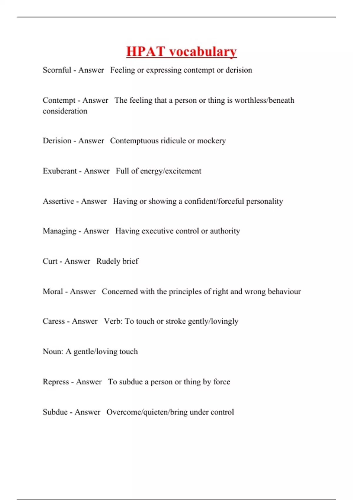 Scornful - Answer Feeling or expressing contempt or derision Contempt - Answer The feeling that a person or thing is worthless/beneath consideration Derision - Answer Contemptuous ridicule or mockery Exuberant - Answer Full of energy/excitement Assertive - Answer Having or showing a confident/forceful personality Managing - Answer Having executive control or authority Curt - Answer Rudely brief Moral - Answer Concerned with the principles of right and wrong behaviour Caress - Answer Verb: To touch or stroke gently/lovingly Noun: A gentle/loving touch Repress - Answer To subdue a person or thing by force Subdue - Answer Overcome/quieten/bring under control