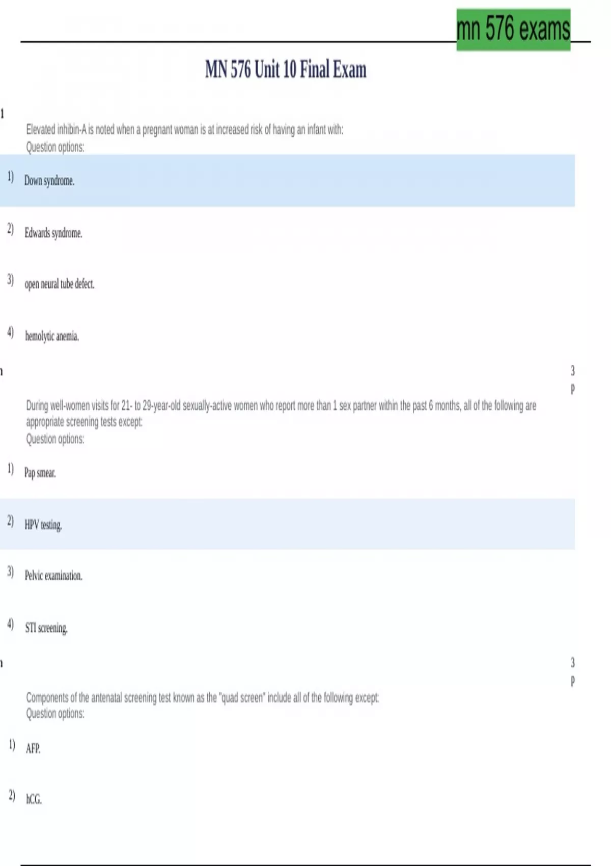 Elevated inhibin-A is noted when a pregnant woman is at increased risk of having an infant with: Question options: 1) Down syndrome. 2) Edwards syndrome. 3) open neural tube defect. 4) hemolytic anemia. n 3pDuring well-women visits for 21- to 29-year-old sexually-active women who report more than 1 sex partner within the past 6 months, all of the following are appropriate screening tests except: Question options: 1) Pap smear. 2) HPV testing. 3) Pelvic examination. 4) STI screening. n 3pComponents of the antenatal screening test known as the "quad screen" include all of the following except: Question options: 1) AFP. 2) hCG. MN 576 Unit 10 Final Exam 3) unconjugated estriol. 4) progesterone. n 0 / 3 points Anxiety in response to a challenging life event is a natural response by the body to: Question options: 1) help a person focus on the issue at hand. 2) diminish the fight-or-flight response. 3) impair decision-making under duress. 4) provide transient improvement in physical capabilities. n 3 / 3 points Women who experienced gestational diabetes are at higher risk of developing Type 2 Diabetes later in life. Question options: 1) True 2) False n 0 / 3 points Malignant thyroid nodules are more common in women than men. Question options: 1) True 2) False n 3 / 3 points When considering characteristics of the domestic violence perpetrator. One of the best predictors of a subsequent homicide of victims of domestic violence is which of the following? Question options: 1) history of perpetrator striking victim on the face with an open hand MN 576 Unit 10 Final Exam 2) history of perpetrator attempting to strangle the victim 3) perpetrator's access to kitchen knives. 4) alcohol abuse history in the victim n 3 / 3 points Treatment of vulvovaginitis caused by Candida albicans includes: Question options: 1) metronidazole gel. 2) clotrimazole cream. 3) hydrocortisone ointment. 4) clindamycin cream. n 0 / 3 points HDL levels are a better predictor of CAD in women than LDL. Question options: 1) True 2) False