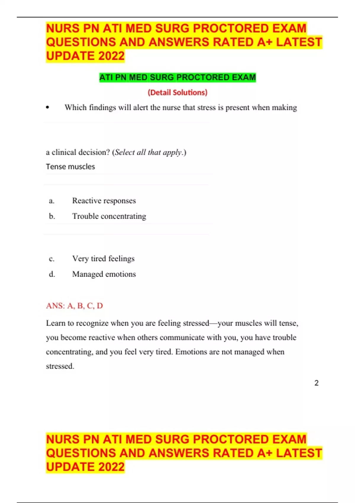 • Which findings will alert the nurse that stress is present when making a clinical decision? (Select all that apply.) Tense muscles a. Reactive responses b. Trouble concentrating c. Very tired feelings d. Managed emotions ANS: A, B, C, D Learn to recognize when you are feeling stressed—your muscles will tense, you become reactive when others communicate with you, you have trouble concentrating, and you feel very tired. Emotions are not managed when stressed. 2 The nurse is using critical thinking skills during the first phase of the nursing process. Which action indicates the nurse is in the first phase?