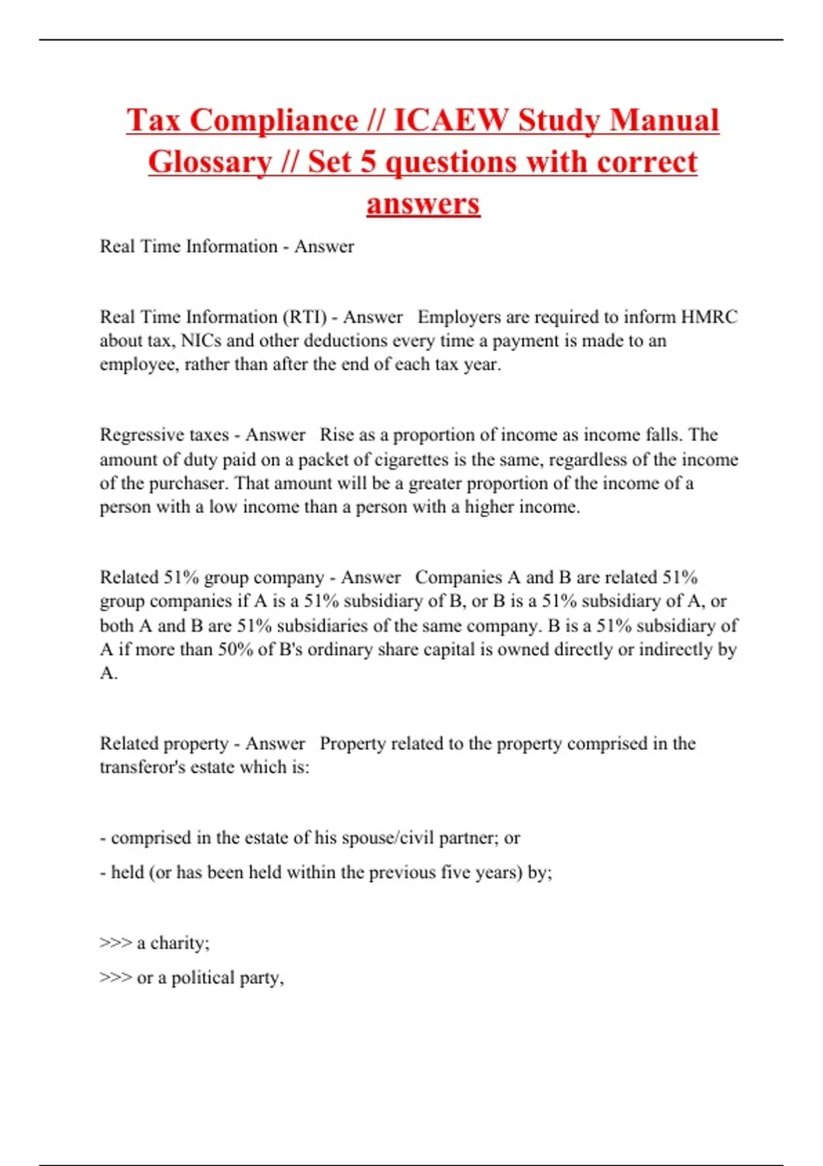 tax compliance icaew study manual glossary set 5 questions with correct answers