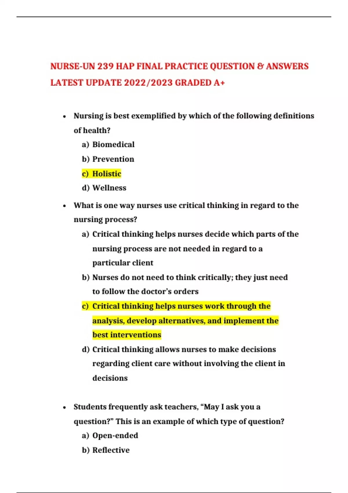 NURSE-UN 239 HAP FINAL PRACTICE QUESTION & ANSWERS LATEST UPDATE 2022/2023 GRADED A+