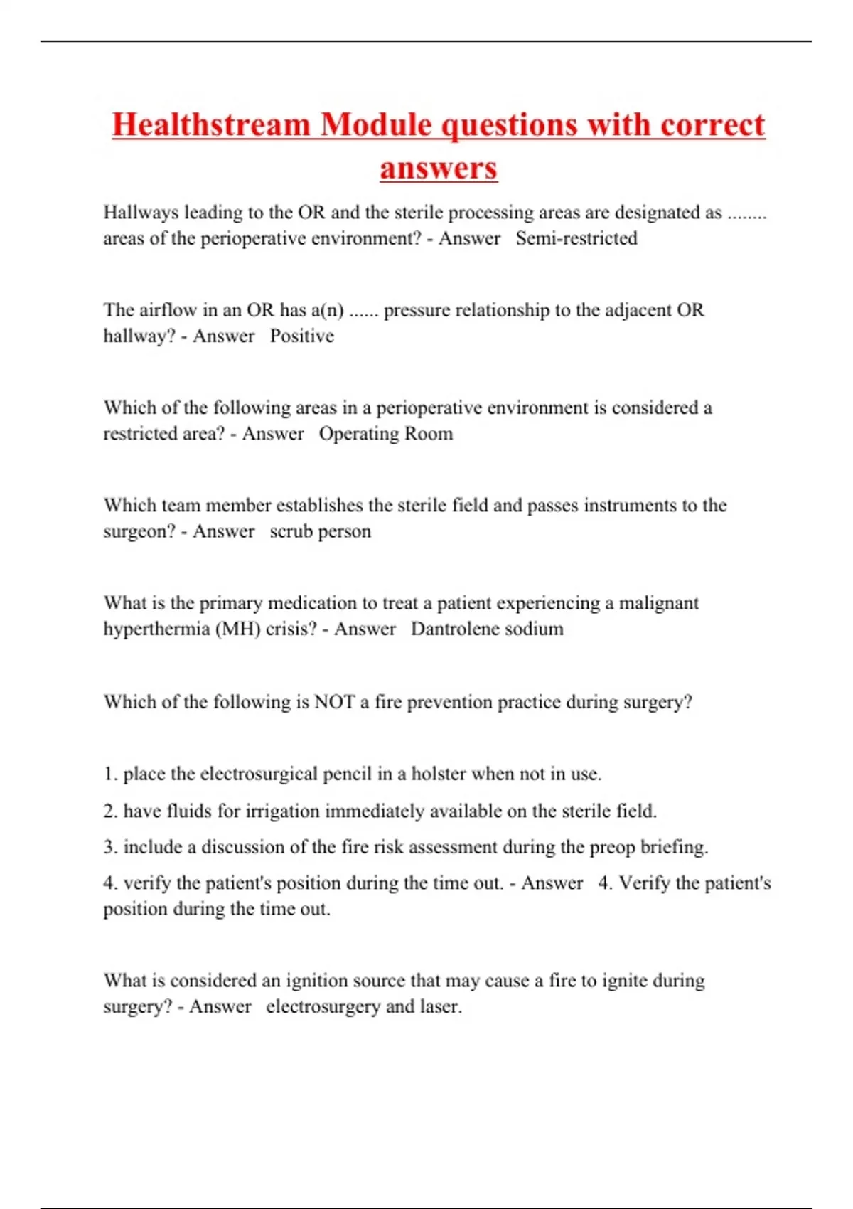 Hallways leading to the OR and the sterile processing areas are designated as ........ areas of the perioperative environment? - Answer Semi-restricted The airflow in an OR has a(n) ...... pressure relationship to the adjacent OR hallway? - Answer Positive Which of the following areas in a perioperative environment is considered a restricted area? - Answer Operating Room Which team member establishes the sterile field and passes instruments to the surgeon? - Answer scrub person What is the primary medication to treat a patient experiencing a malignant hyperthermia (MH) crisis? - Answer Dantrolene sodium Which of the following is NOT a fire prevention practice during surgery? 1. place the electrosurgical pencil in a holster when not in use. 2. have fluids for irrigation immediately available on the sterile field. 3. include a discussion of the fire risk assessment during the preop briefing. 4. verify the patient's position during the time out. - Answer 4. Verify the patient's position during the time out. What is considered an ignition source that may cause a fire to ignite during surgery? - Answer electrosurgery and laser.