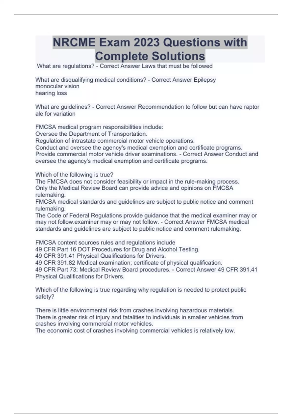 NRCME Exam 2023 Questions with Complete Solutions What are regulations? - Correct Answer Laws that must be followed What are disqualifying medical conditions? - Correct Answer Epilepsy monocular vision hearing loss What are guidelines? - Correct Answer Recommendation to follow but can have raptor ale for variation FMCSA medical program responsibilities include: Oversee the Department of Transportation. Regulation of intrastate commercial motor vehicle operations. Conduct and oversee the agency's medical exemption and certificate programs. Provide commercial motor vehicle driver examinations. - Correct Answer Conduct and oversee the agency's medical exemption and certificate programs. Which of the following is true? The FMCSA does not consider feasibility or impact in the rule-making process. Only the Medical Review Board can provide advice and opinions on FMCSA rulemaking. FMCSA medical standards and guidelines are subject to public notice and comment rulemaking. The Code of Federal Regulations provide guidance that the medical examiner may or may not ner may or may not follow. - Correct Answer FMCSA medical standards and guidelines are subject to public notice and comment rulemaking. FMCSA content sources rules and regulations include 49 CFR Part 16 DOT Procedures for Drug and Alcohol Testing. 49 CFR 391.41 Physical Qualifications for Drivers. 49 CFR 391.82 Medical examination; certificate of physical qualification. 49 CFR Part 73: Medical Review Board procedures. - Correct Answer 49 CFR 391.41 Physical Qualifications for Drivers. Which of the following is true regarding why regulation is needed to protect public safety? There is little environmental risk from crashes involving hazardous materials. There is greater risk of injury and fatalities to individuals in smaller vehicles from crashes involving commercial motor vehicles. The economic cost of crashes involving commercial vehicles is relatively low.