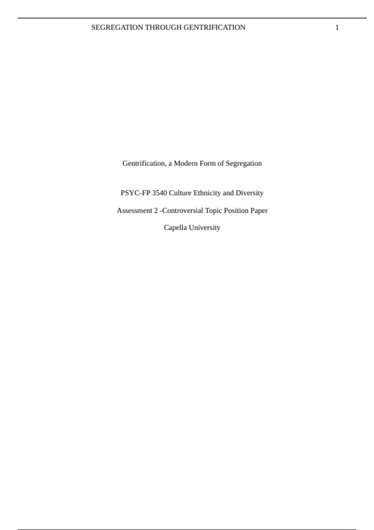 Capella University PSYC-3540 Assessment 3 Controversial Topic Essay - Segregation through Gentrification
