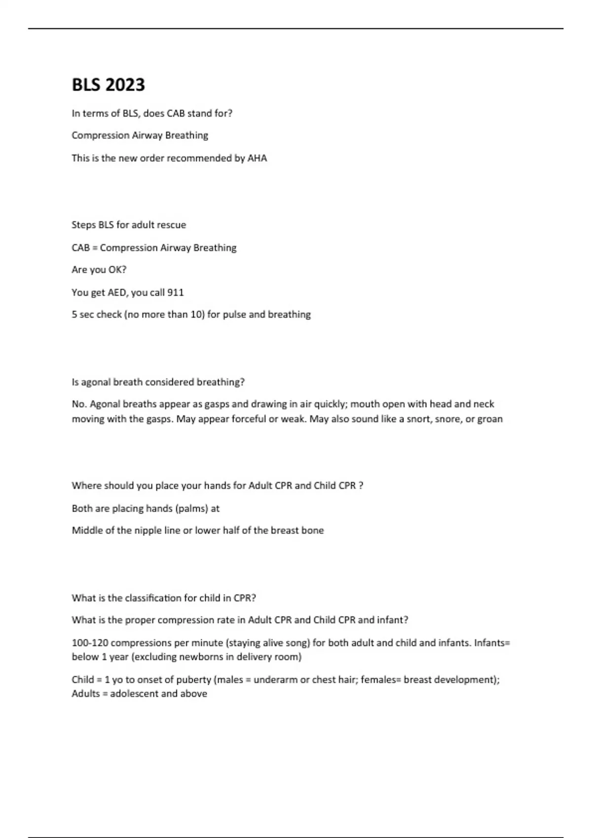In terms of BLS, does CAB stand for? Compression Airway Breathing This is the new order recommended by AHA Steps BLS for adult rescue CAB = Compression Airway Breathing Are you OK? You get AED, you call 911 5 sec check (no more than 10) for pulse and breathing Is agonal breath considered breathing? No. Agonal breaths appear as gasps and drawing in air quickly; mouth open with head and neck moving with the gasps. May appear forceful or weak. May also sound like a snort, snore, or groan