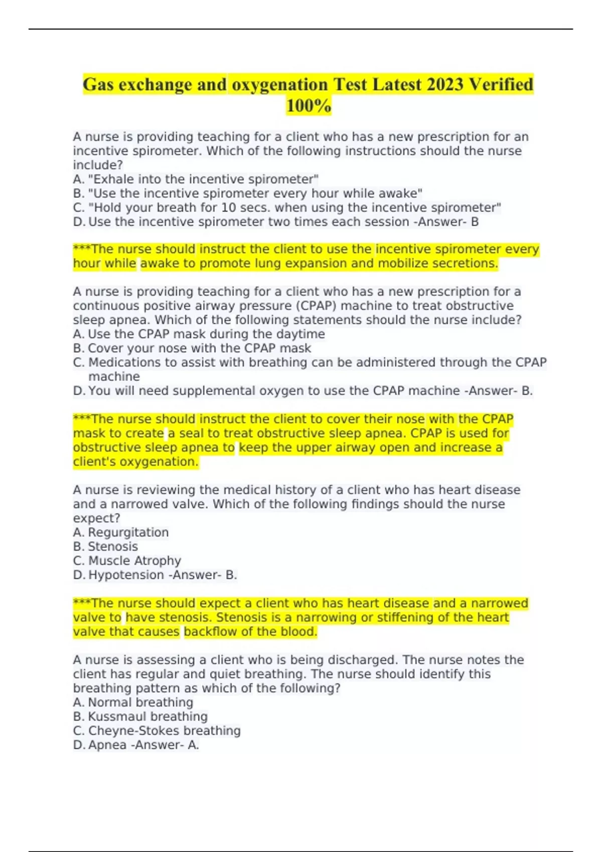 Gas exchange and oxygenation Test Latest 2023 Verified 100% A nurse is providing teaching for a client who has a new prescription for an incentive spirometer. Which of the following instructions should the nurse include? A. "Exhale into the incentive spirometer" B. "Use the incentive spirometer every hour while awake" C. "Hold your breath for 10 secs. when using the incentive spirometer" D. Use the incentive spirometer two times each session -Answer- B ***The nurse should instruct the client to use the incentive spirometer every hour while awake to promote lung expansion and mobilize secretions. A nurse is providing teaching for a client who has a new prescription for a continuous positive airway pressure (CPAP) machine to treat obstructive sleep apnea. Which of the following statements should the nurse include? A. Use the CPAP mask during the daytime B. Cover your nose with the CPAP mask C. Medications to assist with breathing can be administered through the CPAP machine D. You will need supplemental oxygen to use the CPAP machine -Answer- B. ***The nurse should instruct the client to cover their nose with the CPAP mask to create a seal to treat obstructive sleep apnea. CPAP is used for obstructive sleep apnea to keep the upper airway open and increase a client's oxygenation. A nurse is reviewing the medical history of a client who has heart disease and a narrowed valve. Which of the following findings should the nurse expect? A. Regurgitation B. Stenosis C. Muscle Atrophy D. Hypotension -Answer- B. ***The nurse should expect a client who has heart disease and a narrowed valve to have stenosis. Stenosis is a narrowing or stiffening of the heart valve that causes backflow of the blood. A nurse is assessing a client who is being discharged. The nurse notes the client has regular and quiet breathing. The nurse should identify this breathing pattern as which of the following? A. Normal breathing B. Kussmaul breathing C. Cheyne-Stokes breathing D. Apnea -Answer- A. ***A normal breathing pattern is regular, quiet, and shows no manifestations of discomfort. A nurse is caring for a client who has a history of asthma and is wheezing. Which of the following actions should the nurse take first? A. Auscultate the lung sounds. B. Document the respiratory rate C. Obtain the oxygen saturation. D. Check the capillary refill -Answer- C. ***The greatest risk to this client is injury from hypoxia; therefore, the first action the nurse should take is to obtain the client's oxygen saturation. Obtaining the client's oxygen saturation will assist the nurse in determining the next intervention. A nurse is caring for a client who has atelectasis. The nurse should identify that which of the following substance is required to keep the client's alveoli from collapsing and causing atelectasis? A. Lymphatic fluid B. Oxygenated blood, C. Synovial fluid D. Surfactant -Answer- D. *** The nurse should identify that surfactant is a lubricant required to keep alveoli in the lungs from collapsing during exhalation. A lack of surfactant can result in atelectasis. A nurse is assessing a client who has COPD. The nurse should identify that which of the following is an expected finding? A. jugular vein distension B. clubbing of the fingers C. Heart murmur D. Paradoxical breathing -Answer- B. ***The nurse should identify that clubbing of the fingers is an expected finding for a client who has a chrnic pulmonary disease, such as COPD. A nurse is caring for a client who is receiving supplemental oxygen for hypoxia. The nurse should identify that which of the following can cause hypoxia? A. Diabetic ketoacidosis B. Smoke inhalation C. Administration of a stimulant medication D. Right-sided heart failure -Answer- B. ***The nurse should identify that smoke inhalation can cause hypoxia. Smoke inhalation can cause a client to become hypoxic due to a lack of oxygen and ventilation A nurse is teaching a newly licensed nurse about pulmonary function tests. The nurse should include that which of the following is the vital capacity? A. The volume of air inspired and expired with a regular breath B. The maximum volume of air that is expired after a maximum inspiration C. The amount of additional air that can be inspired after a regular inspiration D. The amount of air in the lung after maximal inspiration -Answer- B. ***The vital capacity is the amount of air that is forcibly expelled after a maximal inspiration A nurse is suctioning a client's tracheostomy using an open system. Which of the following actions should the nurse take? A. Use clean technique to perform the procedure B. apply suction when inserting the catheter C. Administer 100% oxygen before the procedure D. Suction the tracheostomy for 20 seconds each time. -Answer- C. ' ***The nurse should administer 100% oxygen to the client before the procedure to reduce the risk for hypoxia A nurse is teaching a client who has an abdominal incision about coughing and deep breathing. In which order should the nurse instruct the client to perform the following steps? (Move the steps into the box on the right, placing them in the selected order of performance. Use all the steps.) -Answer- 1- Take a deep breath 2- Hold your breath for several seconds 3. Exhale slowly 4. Brace the incision with a pillow and try to cough deeply A nurse is assessing a client who is receiving oxygen therapy. The nurse should identify that which of the following findings can indicate oxygen toxicity? A. Hypertension B. Ringing in the ears C. Fever D. Dilated pupils -Answer- B. ***The nurse should identify that ringing in the ears, as well as headache, disorientation, and muscle twitching can indicate oxygen toxicity A nurse is auscultating a client's heart sounds and hears a low-pitched whooshing or blowing sound over the apex of the heart. The nurse should identify that this indicates which of the following? A. Tachycardia B. Murmur C. Gallop D. Stroke volume -Answer- B. ***A whooshing or blowing sound indicates a