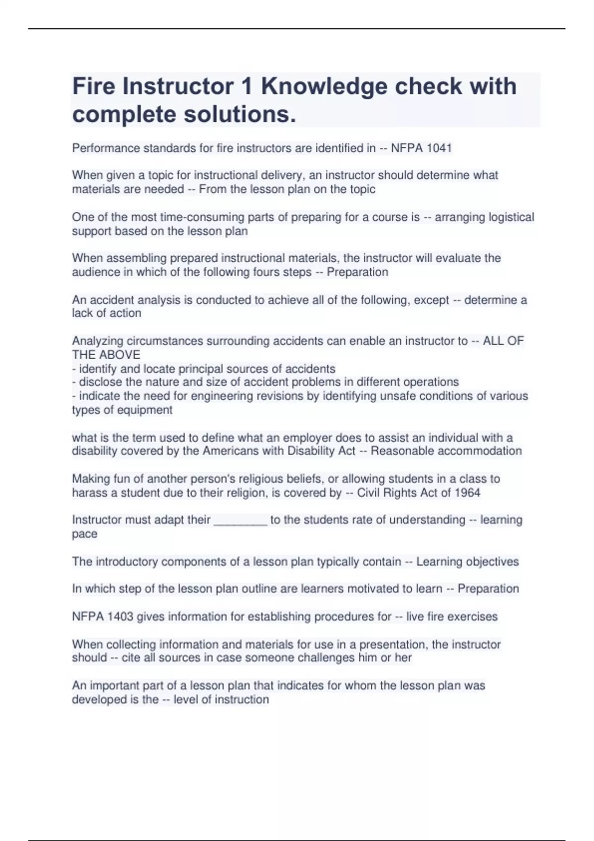 Fire Instructor 1 Knowledge check with complete solutions. Performance standards for fire instructors are identified in -- NFPA 1041 When given a topic for instructional delivery, an instructor should determine what materials are needed -- From the lesson plan on the topic One of the most time-consuming parts of preparing for a course is -- arranging logistical support based on the lesson plan When assembling prepared instructional materials, the instructor will evaluate the audience in which of the following fours steps -- Preparation An accident analysis is conducted to achieve all of the following, except -- determine a lack of action Analyzing circumstances surrounding accidents can enable an instructor to -- ALL OF THE ABOVE - identify and locate principal sources of accidents - disclose the nature and size of accident problems in different operations - indicate the need for engineering revisions by identifying unsafe conditions of various types of equipment what is the term used to define what an employer does to assist an individual with a disability covered by the Americans with Disability Act -- Reasonable accommodation Making fun of another person's religious beliefs, or allowing students in a class to harass a student due to their religion, is covered by -- Civil Rights Act of 1964 Instructor must adapt their ________ to the students rate of understanding -- learning pace The introductory components of a lesson plan typically contain -- Learning objectives In which step of the lesson plan outline are learners motivated to learn -- Preparation NFPA 1403 gives information for establishing procedures for -- live fire exercises When collecting information and materials for use in a presentation, the instructor should -- cite all sources in case someone challenges him or her An important part of a lesson plan that indicates for whom the lesson plan was developed is the -- level of instruction The purpose of the presentation step of the instructional process is to -- Present new skills and concepts Directions: Read the following statements regarding instructors, then select your answer -- INSTRUCTORS LEAD OR GUIDE LEARNERS THROUGH A CLASS INSTRUCTORS MUST HAVE A DESIRE TO UNDERSTAND THE NEEDS OF LEARNERS which of the flowing statements IS NOT TRUE regarding the functions of a lesson plan - - they are a rigid procedure that must be followed for successful teaching