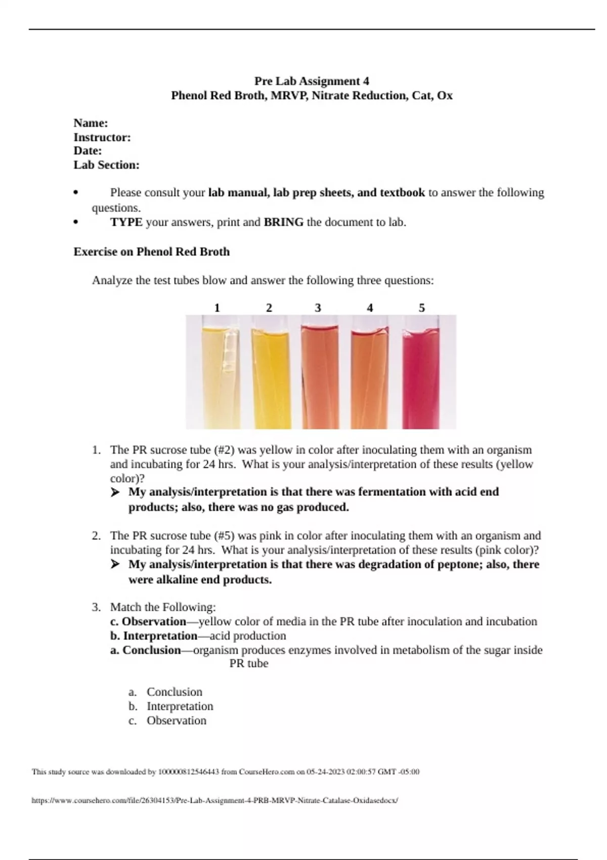 Exercise on Phenol Red Broth Analyze the test tubes blow and answer the following three questions: 1 2 3 4 5 1. The PR sucrose tube (#2) was yellow in color after inoculating them with an organism and incubating for 24 hrs. What is your analysis/interpretation of these results (yellow color)? My analysis/interpretation is that there was fermentation with acid end products; also, there was no gas produced. 2. The PR sucrose tube (#5) was pink in color after inoculating them with an organism and incubating for 24 hrs. What is your analysis/interpretation of these results (pink color)? My analysis/interpretation is that there was degradation of peptone; also, there were alkaline