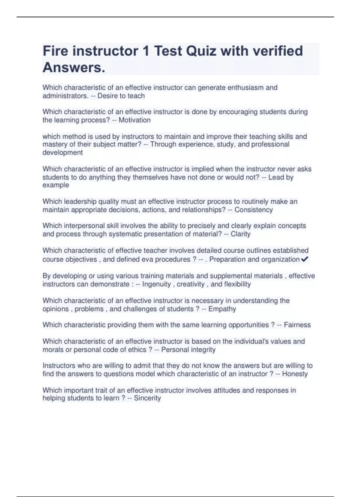 Fire instructor 1 Test Quiz with verified Answers | Latest 2023/2024 Which characteristic of an effective instructor can generate enthusiasm and administrators. -- Desire to teach Which characteristic of an effective instructor is done by encouraging students during the learning process? -- Motivation which method is used by instructors to maintain and improve their teaching skills and mastery of their subject matter? -- Through experience, study, and professional development Which characteristic of an effective instructor is implied when the instructor never asks students to do anything they themselves have not done or would not? -- Lead by example Which leadership quality must an effective instructor process to routinely make an maintain appropriate decisions, actions, and relationships? -- Consistency Which interpersonal skill involves the ability to precisely and clearly explain concepts and process through systematic presentation of material? -- Clarity Which characteristic of effective teacher involves detailed course outlines established course objectives , and defined eva procedures ? -- . Preparation and organization By developing or using various training materials and supplemental materials , effective instructors can demonstrate : -- Ingenuity , creativity , and flexibility Which characteristic of an effective instructor is necessary in understanding the opinions , problems , and challenges of students ? -- Empathy Which characteristic providing them with the same learning opportunities ? -- Fairness Which characteristic of an effective instructor is based on the individual's values and morals or personal code of ethics ? -- Personal integrity Instructors who are willing to admit that they do not know the answers but are willing to find the answers to questions model which characteristic of an instructor ? -- Honesty Which important trait of an effective instructor involves attitudes and responses in helping students to learn ? -- Sincerity