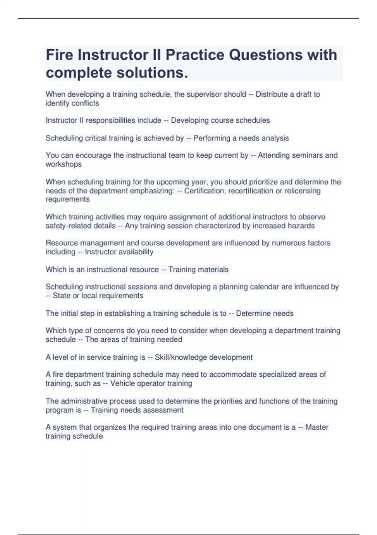 Fire Instructor II Practice Questions with complete solutions | Latest 2023/2024 When developing a training schedule, the supervisor should -- Distribute a draft to identify conflicts Instructor II responsibilities include -- Developing course schedules Scheduling critical training is achieved by -- Performing a needs analysis You can encourage the instructional team to keep current by -- Attending seminars and workshops When scheduling training for the upcoming year, you should prioritize and determine the needs of the department emphasizing: -- Certification, recertification or relicensing requirements Which training activities may require assignment of additional instructors to observe safety-related details -- Any training session characterized by increased hazards Resource management and course development are influenced by numerous factors including -- Instructor availability Which is an instructional resource -- Training materials Scheduling instructional sessions and developing a planning calendar are influenced by -- State or local requirements The initial step in establishing a training schedule is to -- Determine needs Which type of concerns do you need to consider when developing a department training schedule -- The areas of training needed A level of in service training is -- Skill/knowledge development A fire department training schedule may need to accommodate specialized areas of training, such as -- Vehicle operator training The administrative process used to determine the priorities and functions of the training program is -- Training needs assessment A system that organizes the required training areas into one document is a -- Master training schedule What should you do first when developing a master training schedule for your subordinate instructors -- Complete an agency needs assessment of the regulatory agencies that require training on specific topics When supervising training delivery by subordinate instructors -- Allow for individual styles and experiences in the training schedules In addition to demonstrating effective lead