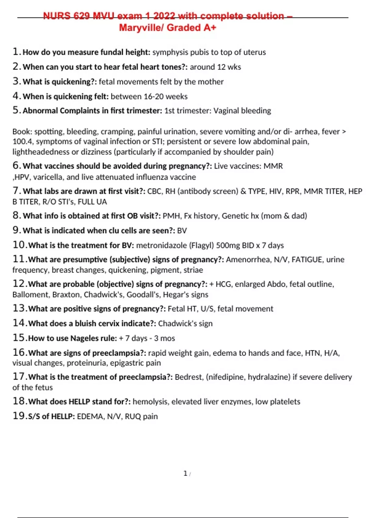1. How do you measure fundal height: symphysis pubis to top of uterus 2. When can you start to hear fetal heart tones?: around 12 wks 3. What is quickening?: fetal movements felt by the mother 4. When is quickening felt: between 16-20 weeks 5. Abnormal Complaints in first trimester: 1st trimester: Vaginal bleeding Book: spotting, bleeding, cramping, painful urination, severe vomiting and/or di- arrhea, fever > 100.4, symptoms of vaginal infection or STI; persistent or severe low abdominal pain, lightheadedness or dizziness (particularly if accompanied by shoulder pain) 6. What vaccines should be avoided during pregnancy?: Live vaccines: MMR ,HPV, varicella, and live attenuated influenza vaccine 7. What labs are drawn at first visit?: CBC, RH (antibody screen) & TYPE, HIV, RPR, MMR TITER, HEP B TITER, R/O STI's, FULL UA 8. What info is obtained at first OB visit?: PMH, Fx history, Genetic hx (mom & dad) 9. What is indicated when clu cells are seen?: BV 10. What is the treatment for BV: metronidazole (Flagyl) 500mg BID x 7 days 11. What are presumptive (subjective) signs of pregnancy?: Amenorrhea, N/V, FATIGUE, urine frequency, breast changes, quickening, pigment, striae 12. What are probable (objective) signs of pregnancy?: + HCG, enlarged Abdo, fetal outline, Balloment, Braxton, Chadwick's, Goodall's, Hegar's signs 13. What are positive signs of pregnancy?: Fetal HT, U/S, fetal movement 14. What does a bluish cervix indicate?: Chadwick's sign 15. How to use Nageles rule: + 7 days - 3 mos 16. What are signs of preeclampsia?: rapid weight gain, edema to hands and face, HTN, H/A, visual changes, proteinuria, epigastric pain 17. What is the treatment of preeclampsia?: Bedrest, (nifedipine, hydralazine) if severe delivery of the fetus 18. What does HELLP stand for?: hemolysis, elevated liver enzymes, low platelets 19. S/S of HELLP: EDEMA, N/V, RUQ pain 20. What should 'at home' plan be for preeclampsia?: high protein diet, daily kick counts, wkly non-stress test & contraction monitor, monitor for hand and face edema, visual changes, B/P, epigastric pain 21. When will you see a drop in the fundal height?: at 36 weeks as the head drops into canal 22. When is subinvolution suspected: when lochia turns bright red with clots 23. How would you treat subinvolution?: Methergine 0.2mg PO TID for up to a week 24. what education should be given with a subinvolution?: if filling pad in an hour or lemon size clots go to ED, if fever culture discharge 25. Clinical presentation of mastitis?: unilateral breast red, painful, warm to touch usually clogged milk duct 26. What education do you give with mastatitis: Continue to BF, Pump if breast are still hard after feeding, warm compress 27. What B/C is used if still breastfeeding?: Progesterone only 28. When and how to screen for 1 hr GTT: between 24-28 wks, no need to fast, if over 140 then 3 hr GTT is needed 29. How is gestational diabetes diagnosed?: if the 1 hr gtt is >180 auto dx; if 3 hr gtt is 95 fasting, >180 @ 1hr, >153 @ 2 hr, >140 @ 3 hr