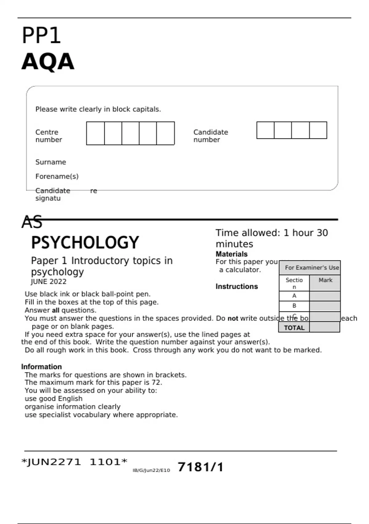 AQA JUNE 2022 AS PSYCHOLOGY Paper 1 FINAL QUESTION PAPER Introductory topics in psychology