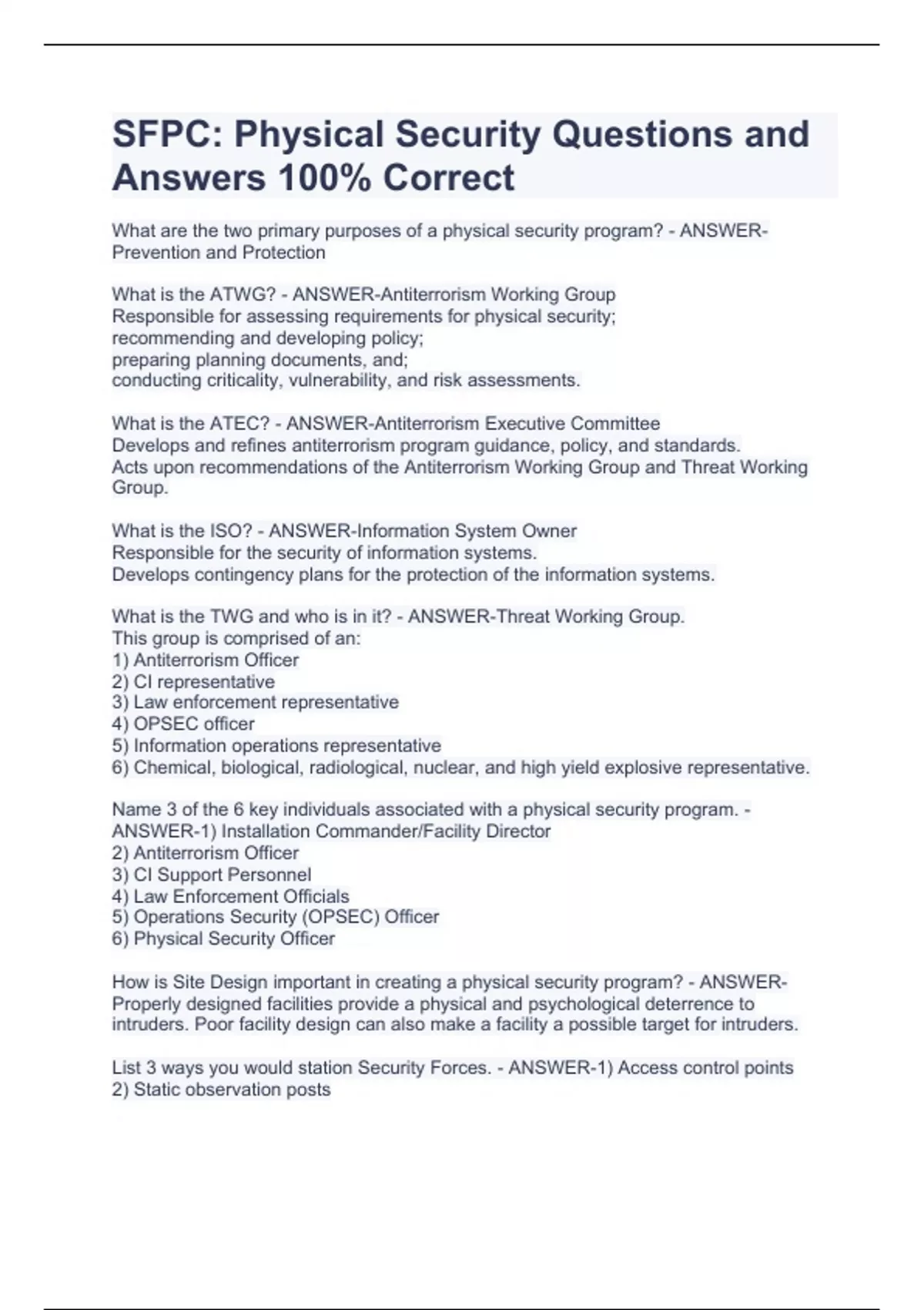 SFPC: Physical Security Questions and Answers 100% CorrectSFPC: Physical Security Questions and Answers 100% Correct What are the two primary purposes of a physical security program? - ANSWER-Prevention and Protection What is the ATWG? - ANSWER-Antiterrorism Working Group Responsible for assessing requirements for physical security; recommending and developing policy; preparing planning documents, and; conducting criticality, vulnerability, and risk assessments. What is the ATEC? - ANSWER-Antiterrorism Executive Committee Develops and refines antiterrorism program guidance, policy, and standards. Acts upon recommendations of the Antiterrorism Working Group and Threat Working Group. What is the ISO? - ANSWER-Information System Owner Responsible for the security of information systems. Develops contingency plans for the protection of the information systems. What is the TWG and who is in it? - ANSWER-Threat Working Group. This group is comprised of an: 1) Antiterrorism Officer 2) CI representative 3) Law enforcement representative 4) OPSEC officer 5) Information operations representative 6) Chemical, biological, radiological, nuclear, and high yield explosive representative. Name 3 of the 6 key individuals associated with a physical security program. - ANSWER-1) Installation Commander/Facility Director 2) Antiterrorism Officer 3) CI Support Personnel 4) Law Enforcement Officials 5) Operations Security (OPSEC) Officer 6) Physical Security Officer