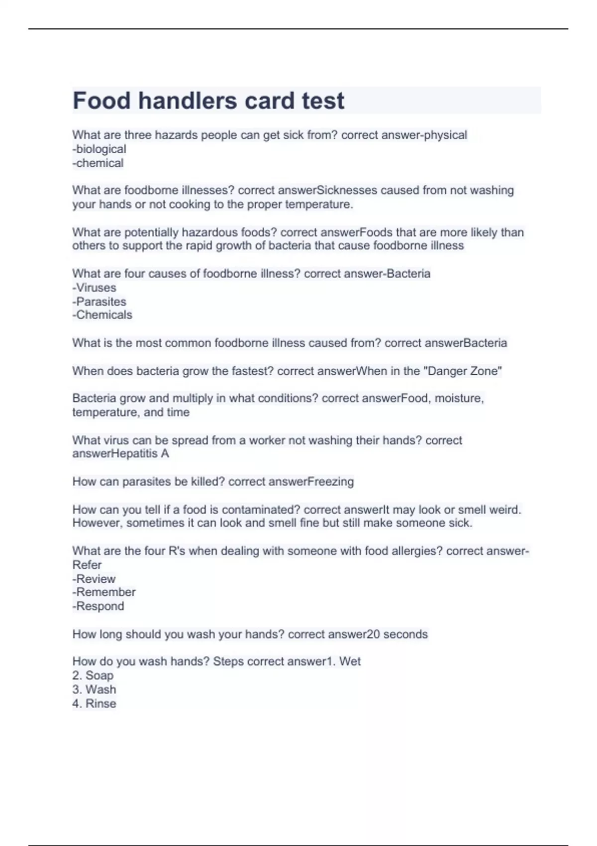 Food handlers card test exam 2023 with 100% correct answers