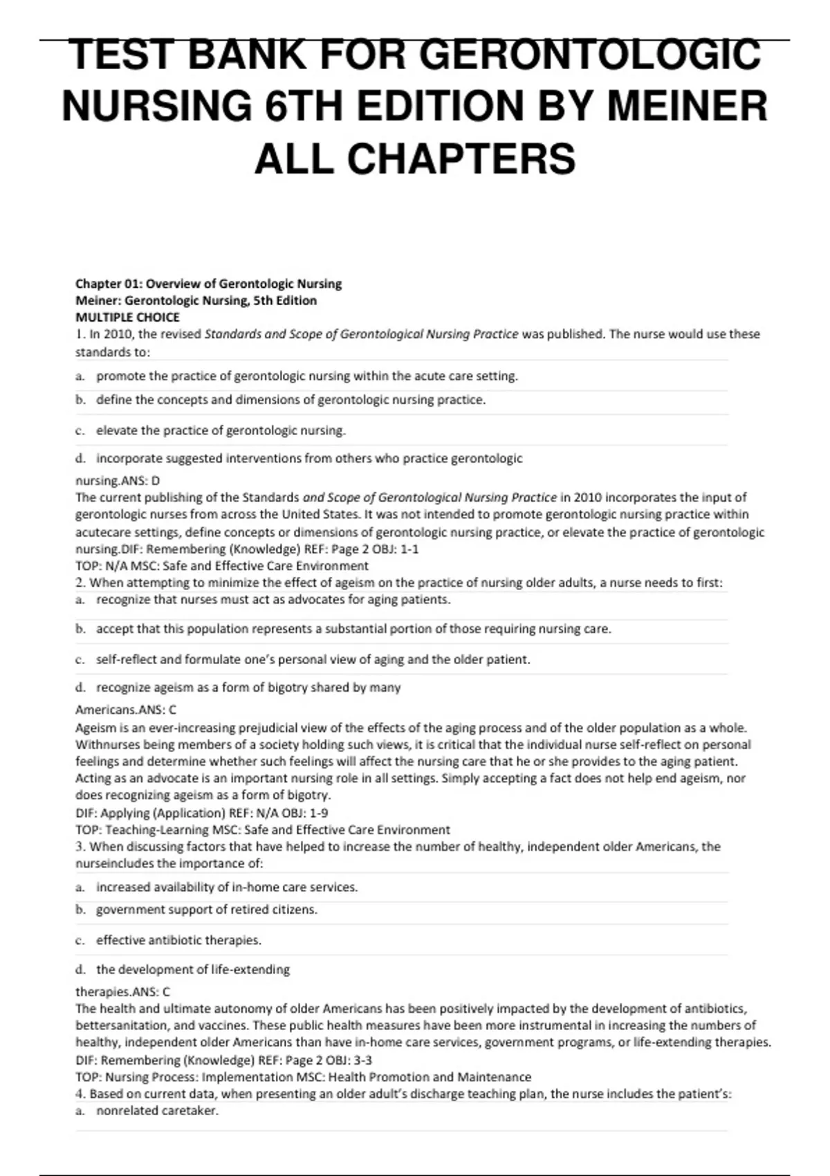 TEST BANK FOR GERONTOLOGIC NURSING 6TH EDITION BY MEINER ALL CHAPTERS /TEST BANK FOR GERONTOLOGIC NURSING 6TH EDITION BY MEINER ALL CHAPTERS /TEST BANK FOR GERONTOLOGIC NURSING 6TH EDITION BY MEINER ALL CHAPTERS