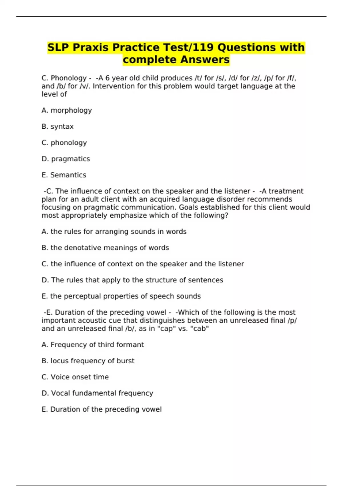 SLP Praxis Practice Test/119 Questions with complete Answers