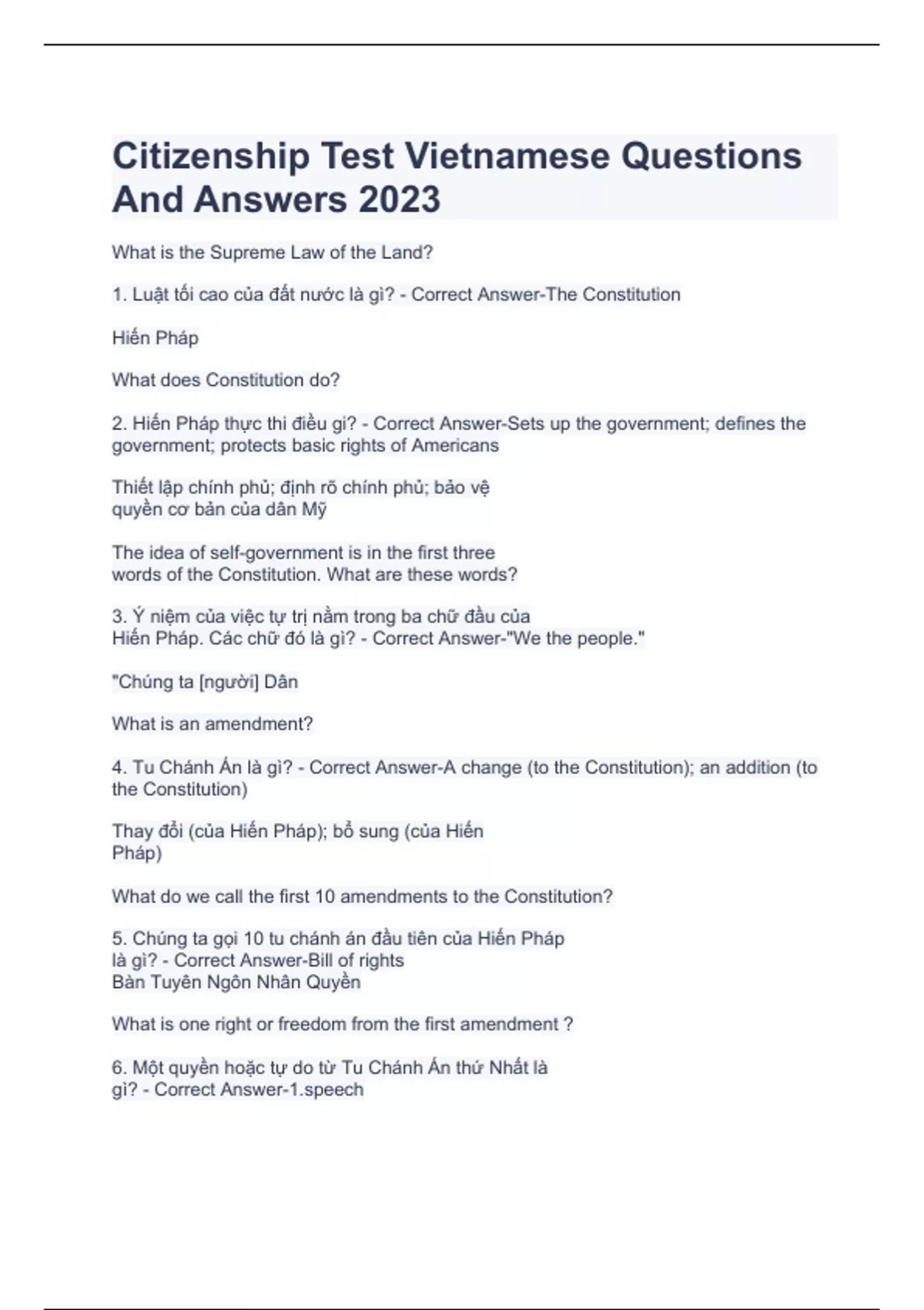 Citizenship Test Vietnamese Questions And Answers 2023
