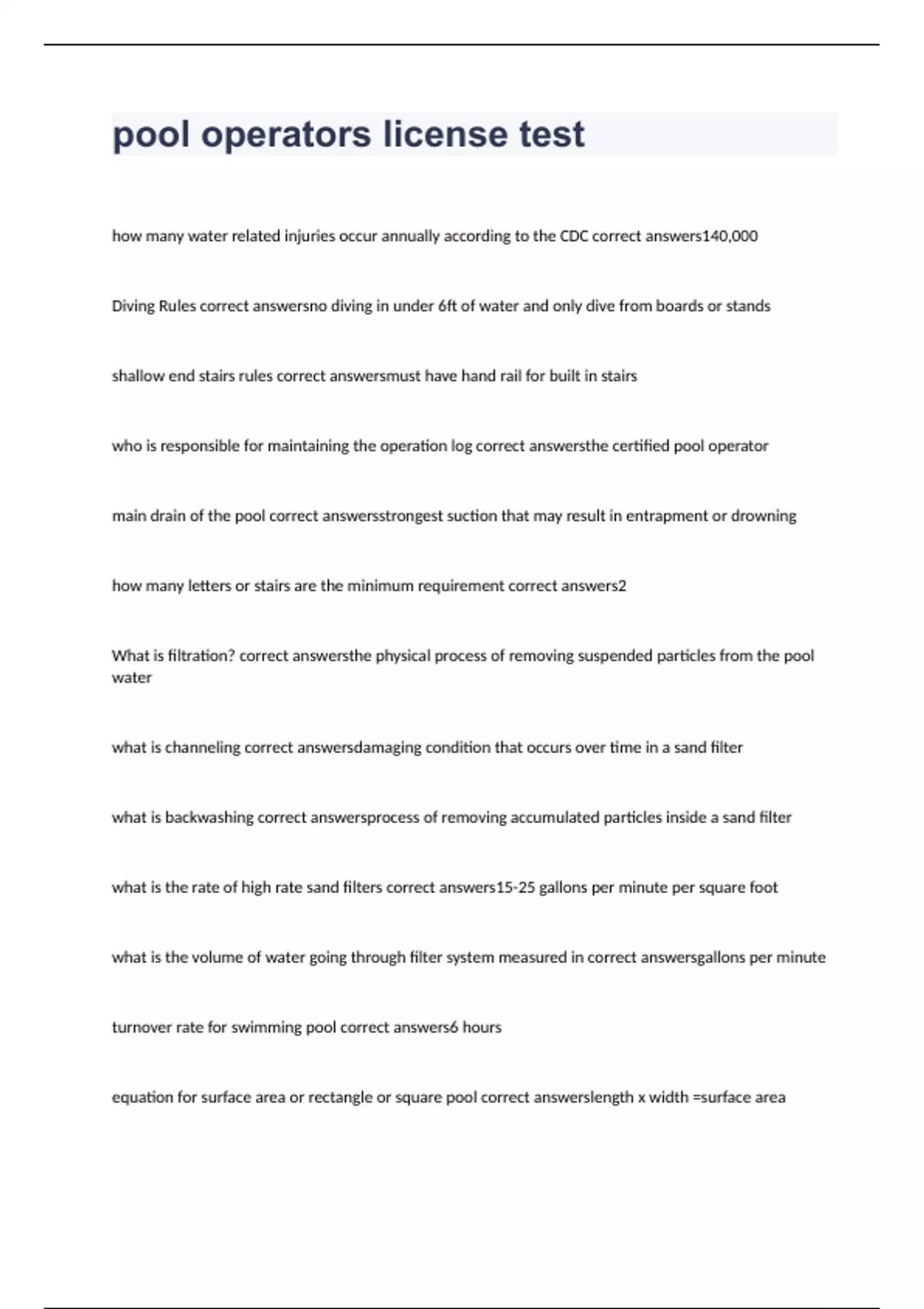 how many water related injuries occur annually according to the CDC 140,000 Diving Rules no diving in under 6ft of water and only dive from boards or stands shallow end stairs rules must have hand rail for built in stairs who is responsible for maintaining the operation log the certified pool operator main drain of the pool strongest suction that may result in entrapment or drowning how many letters or stairs are the minimum requirement 2 What is filtration? the physical process of removing suspended particles from the pool water what is channeling damaging condition that occurs over time in a sand filter what is backwashing process of removing accumulated particles inside a sand filter what is the rate of high rate sand filters 15-25 gallons per minute per square foot what is the volume of water going through filter system measured in gallons per minute turnover rate for swimming pool 6 hours equation for surface area or rectangle or square pool length x width =surface area surface area equation for circular pool (pie)(r^2)= SA equation for volume of swimming pool (L)(W)(D)(7.48) what is the definition of turnover rate amount of time it takes for the total volume of pool water to pass through the circulation system equation for minimum required flow rate (volume of pool/ turnover rate)/60 why does algae form in swimming pool because of pool water circulation
