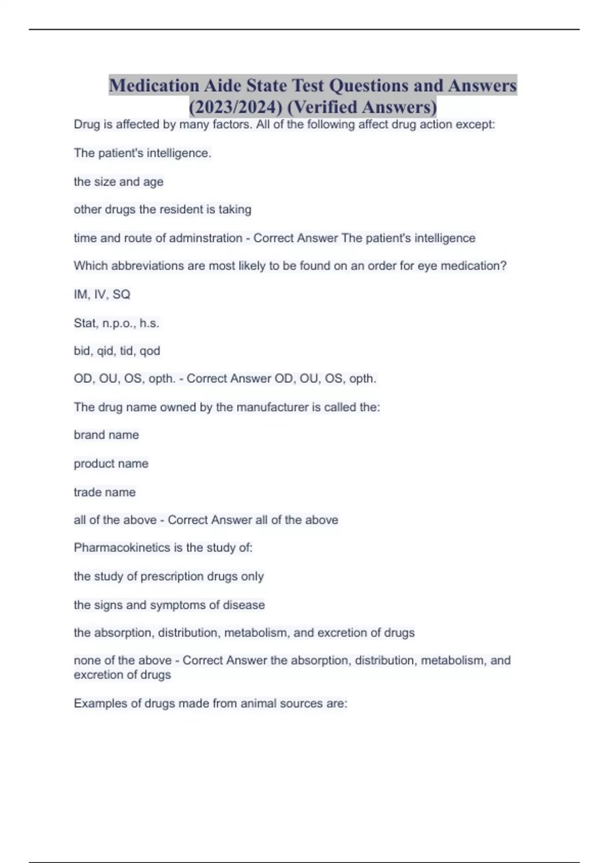 Medication Aide State Test Questions and Answers (2023/2024) (Verified Answers) Drug is affected by many factors. All of the following affect drug action except: The patient's intelligence. the size and age other drugs the resident is taking time and route of adminstration - Correct Answer The patient's intelligence Which abbreviations are most likely to be found on an order for eye medication? IM, IV, SQ Stat, n.p.o., h.s. bid, qid, tid, qod OD, OU, OS, opth. - Correct Answer OD, OU, OS, opth. The drug name owned by the manufacturer is called the: brand name product name trade name all of the above - Correct Answer all of the above Pharmacokinetics is the study of: the study of prescription drugs only the signs and symptoms of disease the absorption, distribution, metabolism, and excretion of drugs none of the above - Correct Answer the absorption, distribution, metabolism, and excretion of drugs Examples of drugs made from animal sources are: