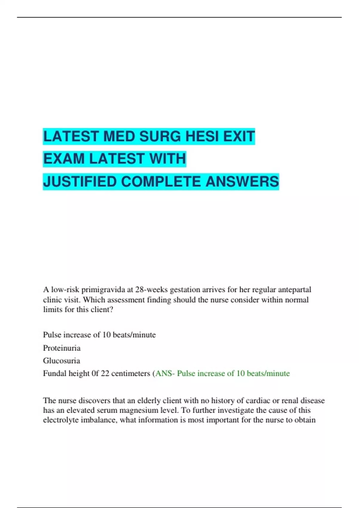 A low-risk primigravida at 28-weeks gestation arrives for her regular antepartal clinic visit. Which assessment finding should the nurse consider within normal limits for this client? Pulse increase of 10 beats/minute Proteinuria Glucosuria Fundal height 0f 22 centimeters (ANS- Pulse increase of 10 beats/minute The nurse discovers that an elderly client with no history of cardiac or renal disease has an elevated serum magnesium level. To further investigate the cause of this electrolyte imbalance, what information is most important for the nurse to obtain from the client's medical history? (ANS- Frequency of laxative use for chronic constipation