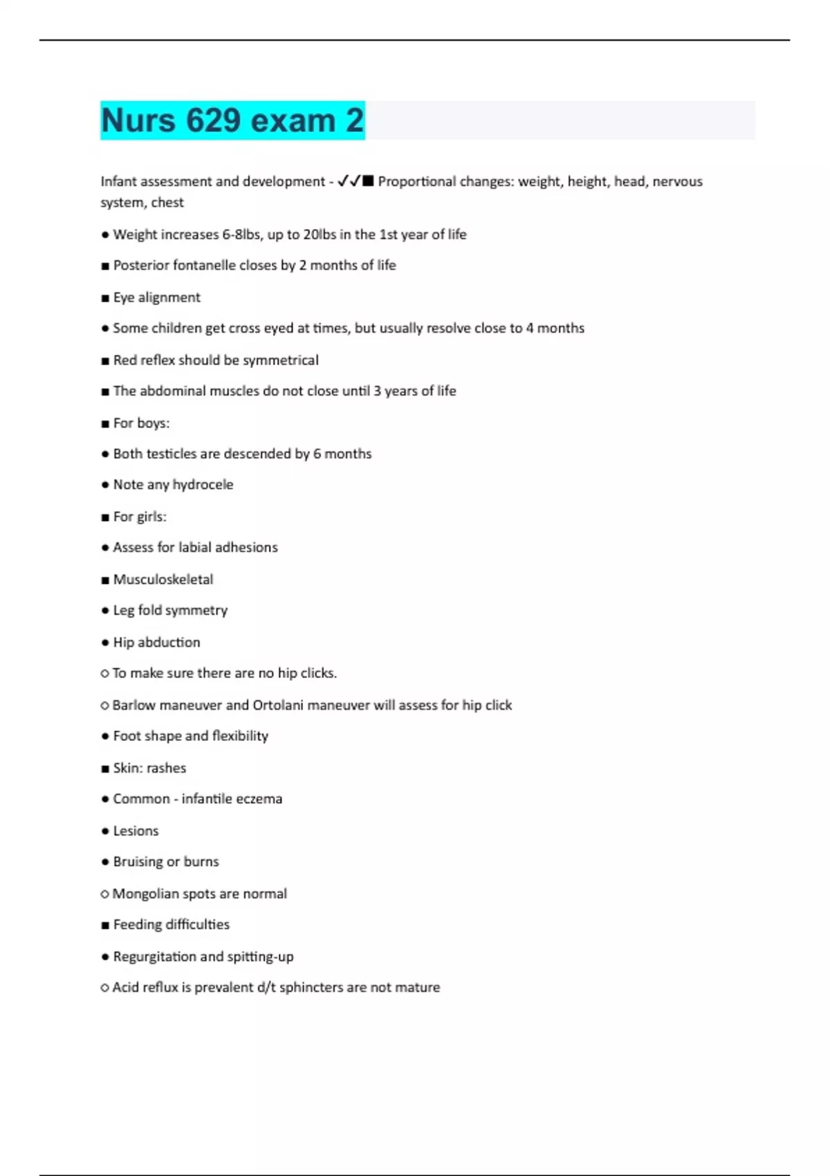 Infant assessment and development - ■ Proportional changes: weight, height, head, nervous system, chest ● Weight increases 6-8lbs, up to 20lbs in the 1st year of life ■ Posterior fontanelle closes by 2 months of life ■ Eye alignment ● Some children get cross eyed at times, but usually resolve close to 4 months ■ Red reflex should be symmetrical ■ The abdominal muscles do not close until 3 years of life ■ For boys: ● Both testicles are descended by 6 months ● Note any hydrocele ■ For girls: ● Assess for labial adhesions ■ Musculoskeletal ● Leg fold symmetry ● Hip abduction ○ To make sure there are no hip clicks. ○ Barlow maneuver and Ortolani maneuver will assess for hip click ● Foot shape and flexibility ■ Skin: rashes ● Common - infantile eczema ● Lesions ● Bruising or burns ○ Mongolian spots are normal ■ Feeding difficulties ● Regurgitation and spitting-up ○ Acid reflux is prevalent d/t sphincters are not mature