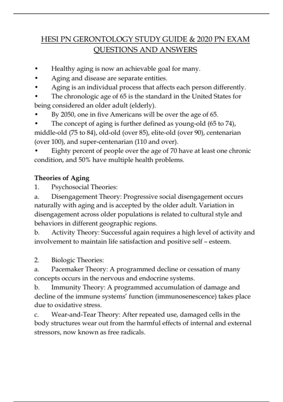 HESI PN GERONTOLOGY STUDY GUIDE & PN EXAM QUESTIONS AND ANSWERS.• Healthy aging is now an achievable goal for many. • Aging and disease are separate entities. • Aging is an individual process that affects each person differently. • The chronologic age of 65 is the standard in the United States for being considered an older adult (elderly). • By 2050, one in five Americans will be over the age of 65. • The concept of aging is further defined as young-old (65 to 74), middle-old (75 to 84), old-old (over 85), elite-old (over 90), centenarian (over 100), and super-centenarian (110 and over). • Eighty percent of people over the age of 70 have at least one chronic condition, and 50% have multiple health problems. Theories of Aging 1. Psychosocial Theories: a. Disengagement Theory: Progressive social disengagement occurs naturally with aging and is accepted by the older adult. Variation in disengagement across older populations is related to cultural style and behaviors in different geographic regions. b. Activity Theory: Successful again requires a high level of activity and involvement to maintain life satisfaction and positive self – esteem. 2. Biologic Theories: a. Pacemaker Theory: A programmed decline or cessation of many concepts occurs in the nervous and endocrine systems. b. Immunity Theory: A programmed accumulation of damage and decline of the immune systems’ function (immunosenescence) takes place due to oxidative stress. c. Wear-and-Tear Theory: After repeated use, damaged cells in the body structures wear out from the harmful effects of internal and external stressors, now known as free radicals.