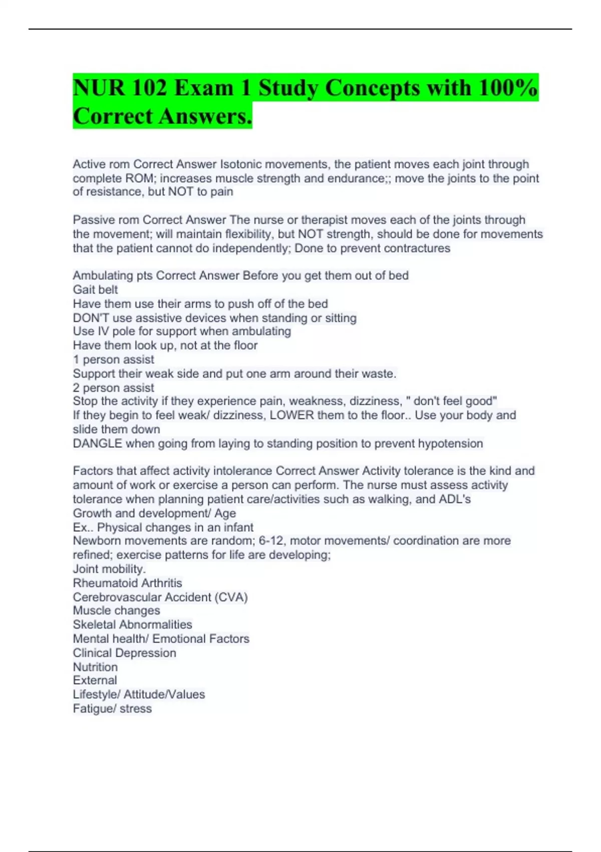 Active rom Correct Answer Isotonic movements, the patient moves each joint through complete ROM; increases muscle strength and endurance;; move the joints to the point of resistance, but NOT to pain Passive rom Correct Answer The nurse or therapist moves each of the joints through the movement; will maintain flexibility, but NOT strength, should be done for movements that the patient cannot do independently; Done to prevent contractures Ambulating pts Correct Answer Before you get them out of bed Gait belt Have them use their arms to push off of the bed DON'T use assistive devices when standing or sitting Use IV pole for support when ambulating Have them look up, not at the floor 1 person assist Support their weak side and put one arm around their waste. 2 person assist Stop the activity if they experience pain, weakness, dizziness, " don't feel good" If they begin to feel weak/ dizziness, LOWER them to the floor.. Use your body and slide them down DANGLE when going from laying to standing position to prevent hypotension Factors that affect activity intolerance Correct Answer Activity tolerance is the kind and amount of work or exercise a person can perform. The nurse must assess activity tolerance when planning patient care/activities such as walking, and ADL's Growth and development/ Age Ex.. Physical changes in an infant Newborn movements are random; 6-12, motor movements/ coordination are more refined; exercise patterns for life are developing; Joint mobility. Rheumatoid Arthritis Cerebrovascular Accident (CVA) Muscle changes Skeletal Abnormalities Mental health/ Emotional Factors Clinical Depression Nutrition External Lifestyle/ Attitude/Values