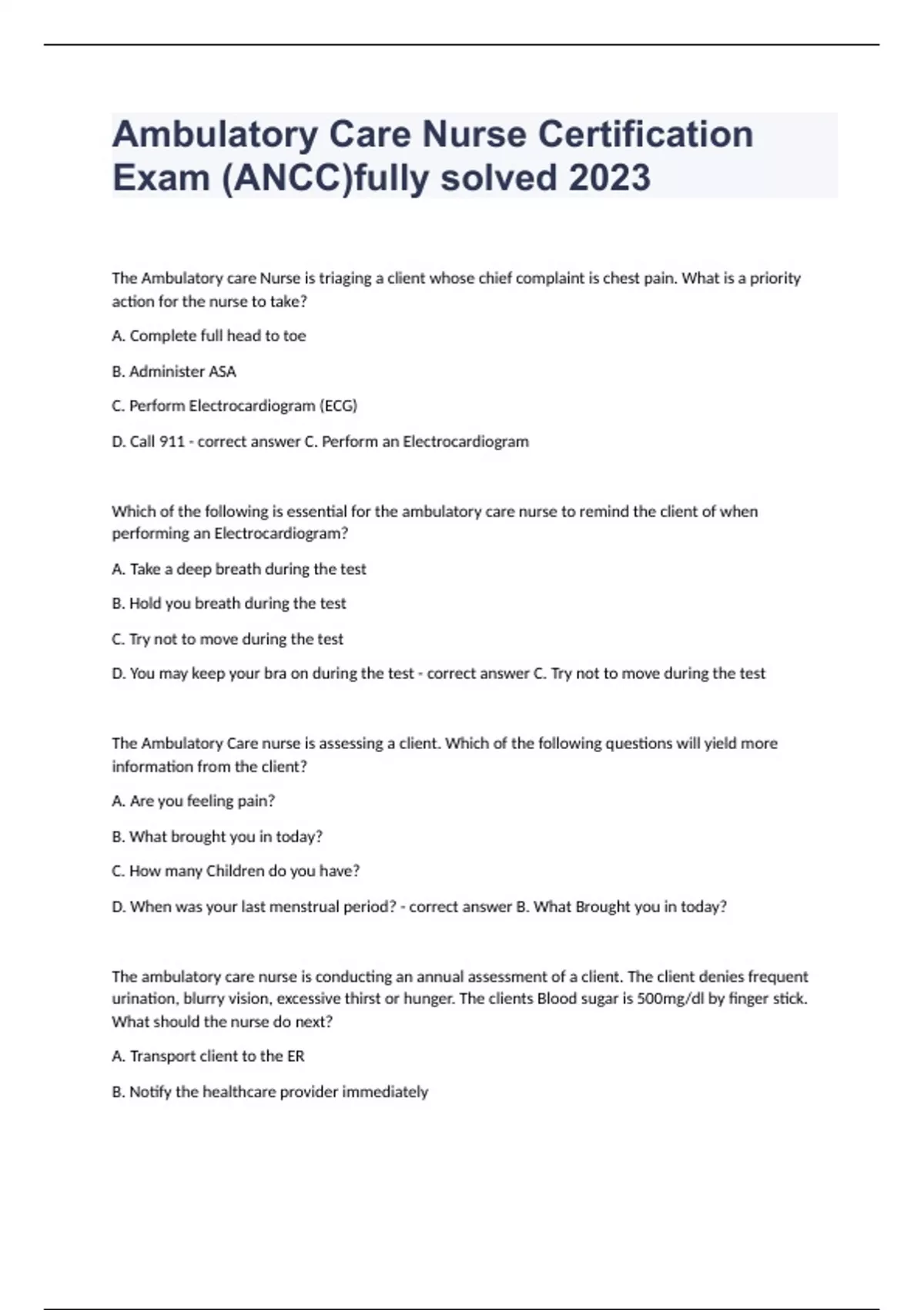 Ambulatory Care Nurse Certification Exam (ANCC)fully solved 2023The Ambulatory care Nurse is triaging a client whose chief complaint is chest pain. What is a priority action for the nurse to take? A. Complete full head to toe B. Administer ASA C. Perform Electrocardiogram (ECG) D. Call 911 - correct answer C. Perform an Electrocardiogram Which of the following is essential for the ambulatory care nurse to remind the client of when performing an Electrocardiogram? A. Take a deep breath during the test B. Hold you breath during the test C. Try not to move during the test D. You may keep your bra on during the test - correct answer C. Try not to move during the test The Ambulatory Care nurse is assessing a client. Which of the following questions will yield more information from the client? A. Are you feeling pain? B. What brought you in today? C. How many Children do you have? D. When was your last menstrual period? - correct answer B. What Brought you in today? The ambulatory care nurse is conducting an annual assessment of a client. The client denies frequent urination, blurry vision, excessive thirst or hunger. The clients Blood sugar is 500mg/dl by finger stick. What should the nurse do next? A. Transport client to the ER B. Notify the healthcare provider immediately C. Retest the Blood glucose D. Order a Hemoglobin A1c - correct answer C. Retest the blood glucose Which of the following laboratory test is most effective in monitoring a client with DM blood glucose level? A. Urine Glucose Level B. Glucometer blood glucose testing C. Hemoglobin A1C D. Creatinine Levels - correct answer C. Hemoglobin A1C The client complains of sporadic Abnormal heart rate. An ECG performed showed Normal Sinus rhythm. Labs were WNL and assessment revealed no cardiovascular abnormalities. Which of the following should the nurse anticipate the healthcare provider will order? A. Halter Monitoring B. Admission to the hospital C. Continuous EEG D. Chest X-ray - correct answer A. Halter Monitoring The Ambulatory care nurse is preparing the client for the application of a Holter monitor. Which information is vital for the nurse to give the client? A. Check blood glucose during halter monitoring B. Maintain normal diet and exercising C. Avoid Microwaves and the use of cell phones D. Reduce exercise routine - correct answer B. Maintain normal Diet and exercise The Ambulatory care nurse is assessing a new graduate nurses' understanding of the importance of getting clients height and weight before chemotherapy. Which statement indicates they understand ? A. Height and weight are seldom required B. height and weight are only needed when the chemotherapy regimen is changed C. Height and weight are needed to calculate the correct dosage of chemotherapy