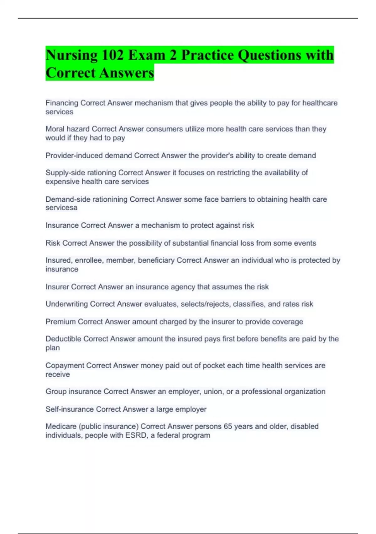 Financing Correct Answer mechanism that gives people the ability to pay for healthcare services Moral hazard Correct Answer consumers utilize more health care services than they would if they had to pay Provider-induced demand Correct Answer the provider's ability to create demand Supply-side rationing Correct Answer it focuses on restricting the availability of expensive health care services Demand-side rationining Correct Answer some face barriers to obtaining health care servicesa Insurance Correct Answer a mechanism to protect against risk Risk Correct Answer the possibility of substantial financial loss from some events Insured, enrollee, member, beneficiary Correct Answer an individual who is protected by insurance Insurer Correct Answer an insurance agency that assumes the risk Underwriting Correct Answer evaluates, selects/rejects, classifies, and rates risk Premium Correct Answer amount charged by the insurer to provide coverage Deductible Correct Answer amount the insured pays first before benefits are paid by the plan Copayment Correct Answer money paid out of pocket each time health services are receive Group insurance Correct Answer an employer, union, or a professional organization Self-insurance Correct Answer a large employer Medicare (public insurance) Correct Answer persons 65 years and older, disabled individuals, people with ESRD, a federal program