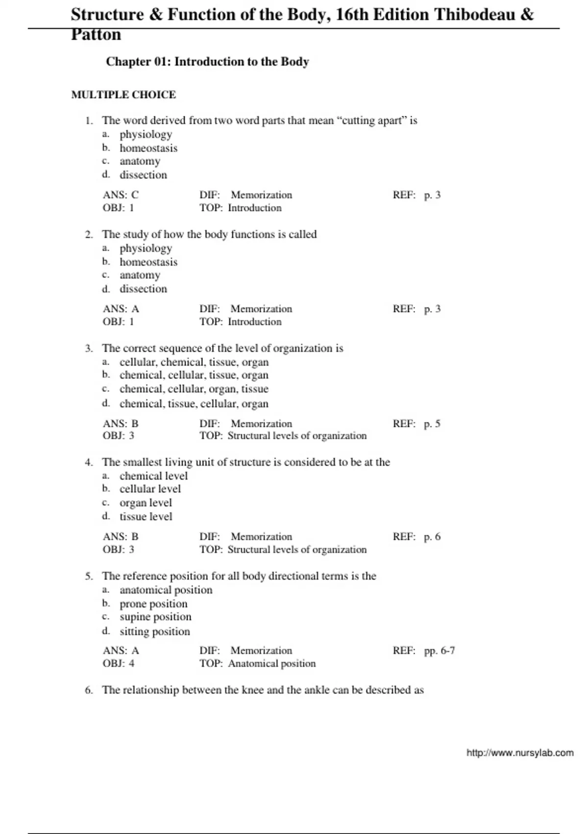 Structure & Function of the Body, 16th Edition Thibodeau & Patton Chapter 01: Introduction to the Body MULTIPLE CHOICE 1. The word derived from two word parts that mean “cutting apart” is a. physiology b. homeostasis c. anatomy d. dissection ANS: C DIF: Memorization REF: p. 3 OBJ: 1 TOP: Introduction 2. The study of how the body functions is called a. physiology b. homeostasis c. anatomy d. dissection ANS: A DIF: Memorization REF: p. 3 OBJ: 1 TOP: Introduction 3. The correct sequence of the level of organization is a. cellular, chemical, tissue, organ b. chemical, cellular, tissue, organ c. chemical, cellular, organ, tissue d. chemical, tissue, cellular, organ ANS: B DIF: Memorization REF: p. 5 OBJ: 3 TOP: Structural levels of organization 4. The smallest living unit of structure is considered to be at the a. chemical level b. cellular level c. organ level d. tissue level ANS: B DIF: Memorization REF: p. 6 OBJ: 3 TOP: Structural levels of organization 5. The reference position for all body directional terms is the a. anatomical position b. prone position c. supine position d. sitting position ANS: A DIF: Memorization REF: pp. 6-7 OBJ: 4 TOP: Anatomical position 6. The relationship between the knee and the ankle can be described as a. the knee is inferior to the ankle b. the knee is distal to the ankle c. the knee is proximal to the ankle d. both a and b above ANS: C DIF: Application REF: pp. 7-8 OBJ: 5 TOP: Anatomical directions 7. The relationship between the heart and the lungs can be described as a. the heart is distal to the lungs b. the heart is medial to the lungs c. the heart is lateral to the lungs d. both a and c above ANS: B DIF: Application REF: p. 7 OBJ: 5 TOP: Anatomical directions 8. The term most opposite proximal is a. medial b. superior c. anterior d. distal ANS: D DIF: Memorization REF: p. 7 OBJ: 5 TOP: Anatomical directions 9. Because humans walk in an upright position, the two terms that can be used interchangeably are a. posterior and ventral b. posterior and inferior c. posterior and superficial d. posterior and dorsal ANS: D DIF: Memorization REF: p. 7 OBJ: 5 TOP: Anatomical directions 10. The term most opposite medial is a. dorsal b. lateral c. superficial d. none of the above ANS: B DIF: Memorization REF: p. 7 OBJ: 5 TOP: Anatomical directions 11. The relationship between the skin and the muscles can be described as a. the skin is superficial to the muscle b. the muscle is superficial to the skin c. the muscle is deep to the skin d. both a and c above ANS: D DIF: Memorization REF: p. 7 OBJ: 3 TOP: Anatomical directions 12. A cut dividing the body into anterior and posterior portions is called a a. sagittal section b. frontal section c. transverse section d. none of the above ANS: B DIF: Memorization REF: p. 9 OBJ: 5 TOP: Planes or body sections 13. A cut dividing the body into upper and lower portions is called a a. sagittal section b. frontal section c. transverse section d. coronal section ANS: C DIF: Memorization REF: p. 9 OBJ: 5 TOP: Planes or body sections 14. A cut dividing the body into right and left portions is called a a. sagittal section b. frontal section c. transverse section d. coronal section ANS: A DIF: Memorization REF: pp. 8-9 OBJ: 5 TOP: Planes or body sections 15. The mediastinum is part of the a. dorsal cavity b. ventral cavity c. abdominal cavity d. both b and c above ANS: B DIF: Memorization REF: p. 9 OBJ: 6 TOP: Body cavities 16. The two major cavities of the body are the a. dorsal and ventral b. thoracic and abdominal c. pleural and mediastinum d. none of the above ANS: A DIF: Memorization REF: p. 9 OBJ: 6 TOP: Body cavities 17. The diaphragm divides the a. dorsal from the ventral cavity b. abdominal from the pelvic cavity c. thoracic from the abdominal cavity d. pleural from the mediastinum ANS: C DIF: Memorization REF: p. 9 OBJ: 6 TOP: Body cavities 18. The upper abdominopelvic regions include the a. right and left hypochondriac and umbilical b. right and left lumbar and umbilical c. right and left iliac and epigastric d. right and left hypochondriac and epigastric ANS: D DIF: Memorization REF: p. 10 OBJ: 7 TOP: Body cavities 19. The middle abdominopelvic regions include the a. right and left lumbar and umbilical b. right and left lumbar and epigastric c. right and left iliac and hypogastric d. right and left iliac and umbilical ANS: A DIF: Memorization REF: p. 10 OBJ: 7 TOP: Body cavities 20. The lower abdominopelvic regions include the a. right and left iliac and umbilical b. right and left lumbar and epigastric c. right and left lumbar and hypogastric d. right and left iliac and hypogastric ANS: D DIF: Memorization REF: p. 10 OBJ: 7 TOP: Body cavities 21. The brain is in the a. ventral cavity b. cranial cavity c. mediastinum d. none of the above ANS: B DIF: Memorization REF: p. 10 OBJ: 6 TOP: Body cavities 22. The spinal cavity is part of the a. dorsal cavity b. ventral cavity c. cranial cavity d. none of the above ANS: A DIF: Memorization REF: p. 9 OBJ: 6 TOP: Body cavities 23. The left upper quadrant of the abdominopelvic cavity includes all of the a. left lumbar region b. left iliac region c. left hypochondriac region d. left inguinal region ANS: C DIF: Application REF: p. 10 OBJ: 7 TOP: Body cavities 24. Using the maintaining of a constant temperature in a building as an example of a feedback loop, the thermometer would be an example of a(n) a. sensor b. control center c. effector d. positive feedback loop ANS: A DIF: Memorization REF: p. 14 OBJ: 9 TOP: The balance of body functions 25. Using the maintaining of a constant temperature in a building as an example of a feedback loop, the furnace would be an example of a(n) a. sensor b. control center c. effector d. positive feedback loop ANS: C DIF: Memorization REF: p. 14 OBJ: 9 TOP: The balance of body functions 26. Using the maintaining of a constant temperature in a building as an example of a feedback loop, the thermostat would be an example of a(n) a. sensor b. control cen