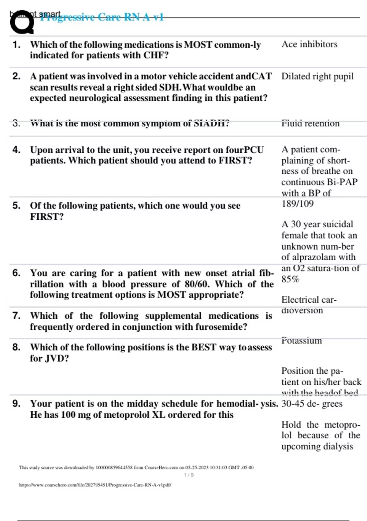 progressive care rn a v1 exam questions with correct answers |100 verified