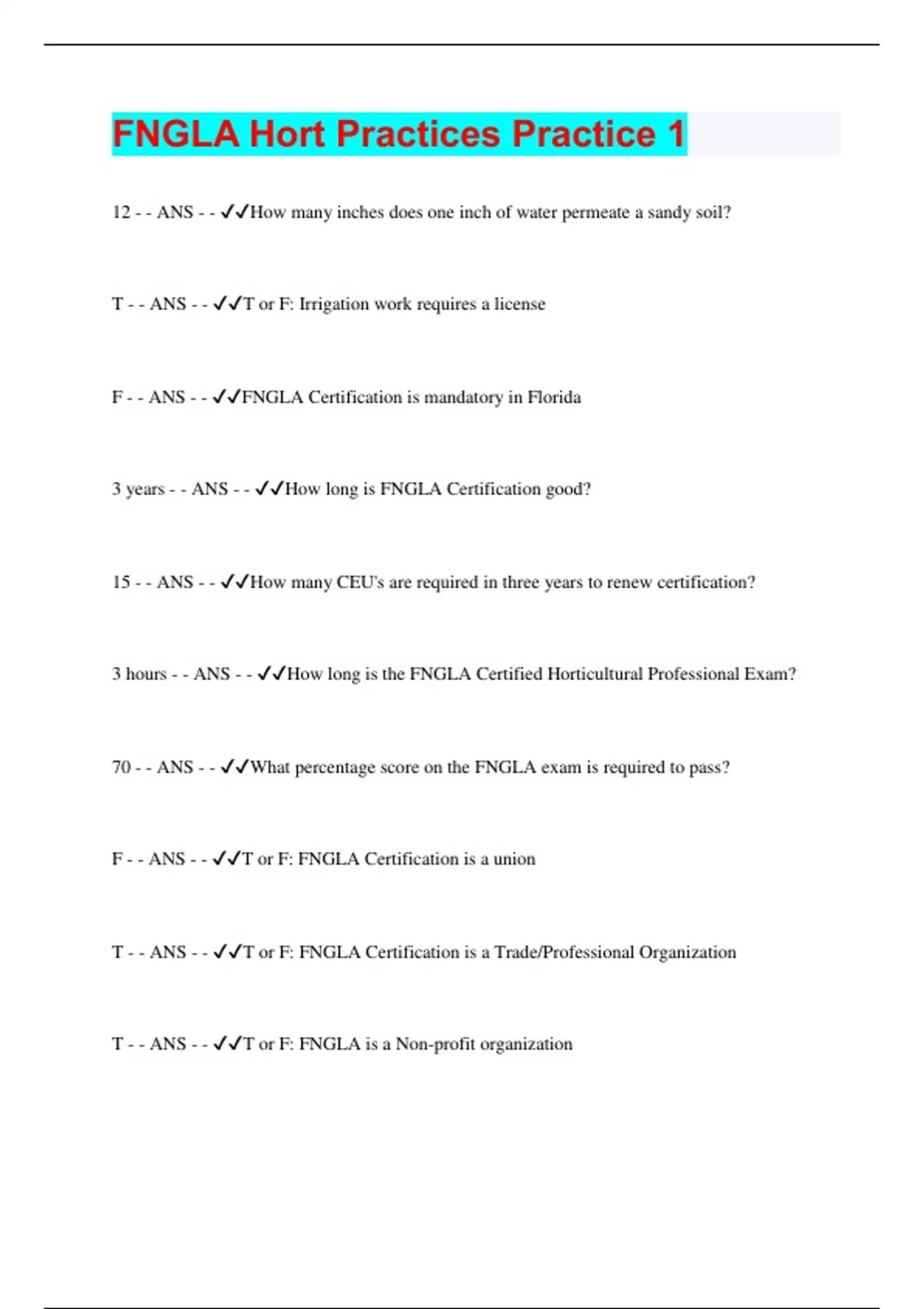 12 - - ANS - - How many inches does one inch of water permeate a sandy soil? T - - ANS - - T or F: Irrigation work requires a license F - - ANS - - FNGLA Certification is mandatory in Florida 3 years - - ANS - - How long is FNGLA Certification good? 15 - - ANS - - How many CEU's are required in three years to renew certification? 3 hours - - ANS - - How long is the FNGLA Certified Horticultural Professional Exam? 70 - - ANS - - What percentage score on the FNGLA exam is required to pass?