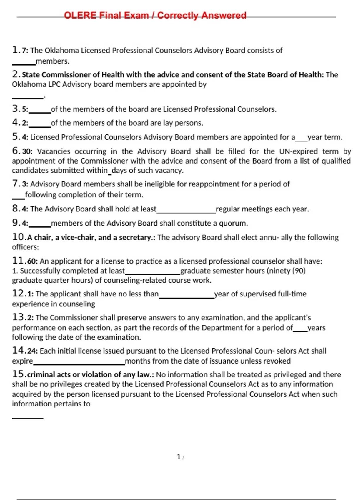 : The Oklahoma Licensed Professional Counselors Advisory Board consists of members. 2. State Commissioner of Health with the advice and consent of the State Board of Health: The Oklahoma LPC Advisory board members are appointed by . 3. 5: of the members of the board are Licensed Professional Counselors. 4. 2: of the members of the board are lay persons. 5. 4: Licensed Professional Counselors Advisory Board members are appointed for a year term. 6. 30: Vacancies occurring in the Advisory Board shall be filled for the UN-expired term by appointment of the Commissioner with the advice and consent of the Board from a list of qualified candidates submitted within days of such vacancy. 7. 3: Advisory Board members shall be ineligible for reappointment for a period of following completion of their term. 8. 4: The Advisory Board shall hold at least regular meetings each year. 9. 4: members of the Advisory Board shall constitute a quorum. 10. A chair, a vice-chair, and a secretary.: The advisory Board shall elect annu- ally the following officers: 11. 60: An applicant for a license to practice as a licensed professional counselor shall have: 1. Successfully completed at least graduate semester hours (ninety (90) graduate quarter hours) of counseling-related course work. 12. 1: The applicant shall have no less than year of supervised full-time experience in counseling 13. 2: The Commissioner shall preserve answers to any examination, and the applicant's performance on each section, as part the records of the Department for a period of years following the date of the examination. 14. 24: Each initial license issued pursuant to the Licensed Professional Coun- selors Act shall expire months from the date of issuance unless revoked 15. criminal acts or violation of any law.: No information shall be treated as privileged and there shall be no privileges created by the Licensed Professional Counselors Act as to any information acquired by the person licensed pursuant to the Licensed Professional Counselors Act when such information pertains to 16. civil, criminal or disciplinary action: If the licensed professional counselor is a party to a arising from such therapy, in which case any waiver of the privilege accorded by this section shall be limited to that action. 17. 100: Any person who practices counseling (without license), upon conviction thereof, shall be guilty of a misdemeanor and shall be punished by imposition of a fine of not less than nor more than Five Hundred Dollars ($500.00) for each offense and in addition may be imprisoned for a term not to exceed six (6) months in the county jail or by both such fine and imprisonment. 18. 1. Been convicted of a felony; 2. Been convicted of a misdemeanor determined to be such a nature as to render the person convicted unfit to practice counseling; 3. Engaged in fraud or deceit in connection with services rendered or in establishing needed qualifications to the provisions of the act; 4. Knowingly aided or abetted a person not licensed pursuant to these provisions in representing himself as a licensed professional counselor in this state; 5. Engaged in unprofessional conduct as defined by the rules established by the Board; 6. Engaging in negligence or wrongful actions in the performance of his duties; or 7. Misrepresented any information required in obtaining a license.: The De- partment, may deny, revoke suspend or place on probation any license or specialty designation issued pursuant to the provisions of the Licensed Professional Coun- selors Act to a licensed professional counselor, if the person has 19. 15: If the Department determines that a felony conviction of an applicant renders the convicted applicant unfit to practice counseling, the Commissioner shall provide notice and opportunity to the applicant, by certified mail at the last known address, for an administrative hearing to contest such determination before the Department may deny the application. The request shall be made by the applicant within days of receipt of the notice. 20. 10,000: The maximum administrative penalty shall not exceed $ . 21. federal, state, or local governmental agencies: All licensed professional counselors, except those employed by , shall, prior to the performance of service, furnish the client with a copy of the Statement of Professional Disclosure as promulgated by rule of the State Board of Health. A current copy shall be on file with the State Department of Health at all times.