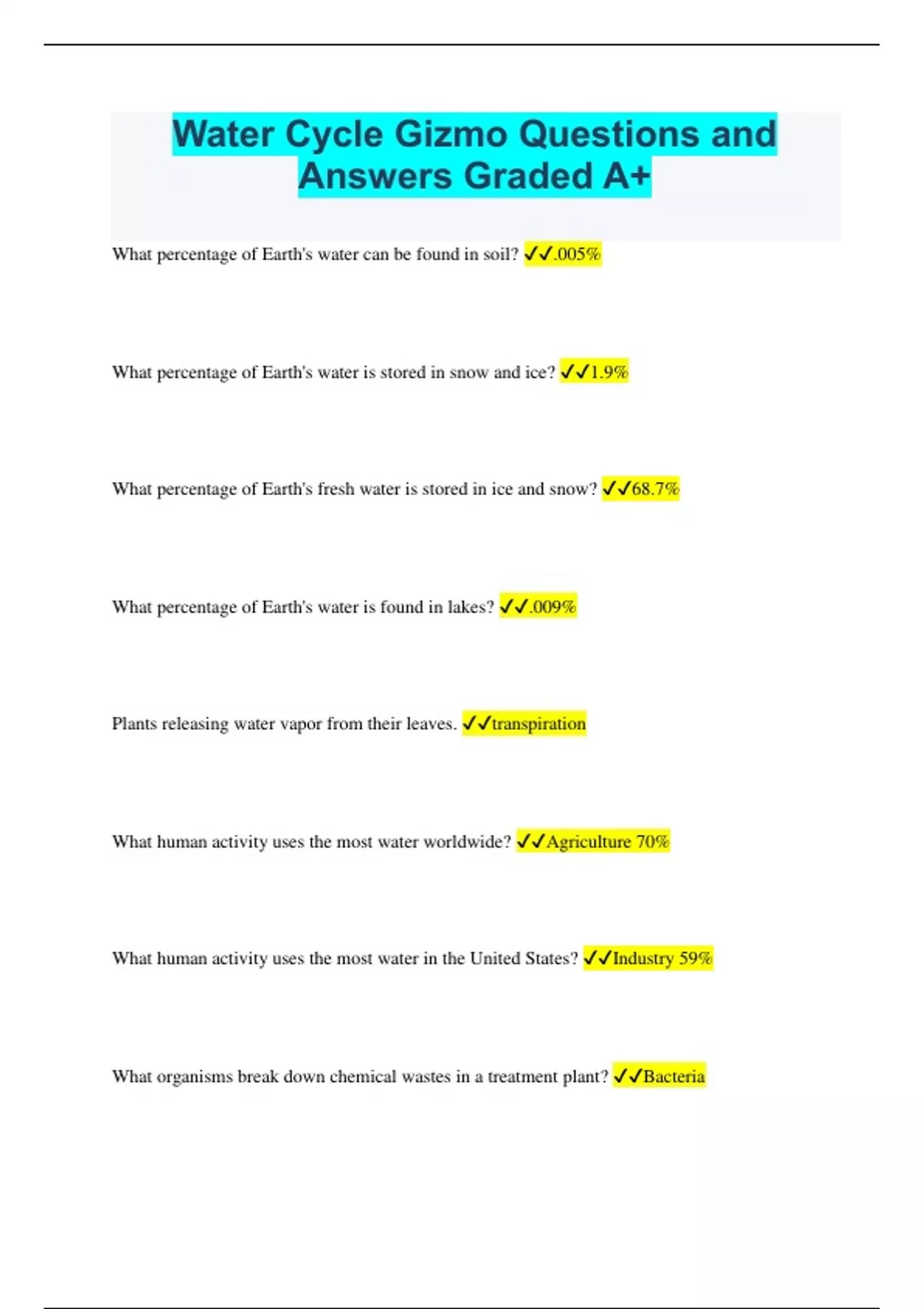 Water Cycle Gizmo Questions and Answers Graded A+ What percentage of Earth's water can be found in soil? .005% What percentage of Earth's water is stored in snow and ice? 1.9% What percentage of Earth's fresh water is stored in ice and snow? 68.7% What percentage of Earth's water is found in lakes? .009% Plants releasing water vapor from their leaves. transpiration What human activity uses the most water worldwide? Agriculture 70% What human activity uses the most water in the United States? Industry 59% What organisms break down chemical wastes in a treatment plant? Bacteria Stores water in the ground aquifer A body of water (often a lake) that stores water for human use. reservoir Ocean to Atmosphere evaporation Atmosphere to Cloud condensation Glacier to River melting Cloud to Soil precipatation Cloud to Snow freezing Ocean to Clouds Evaporation & Condensation Cloud to Glacier Precipatation & Freezing Reason for shortages of water around the world. 97% is salt water, glaciers and ice caps hold most fresh water, Only 1% of water is available for human use, Dry climates do