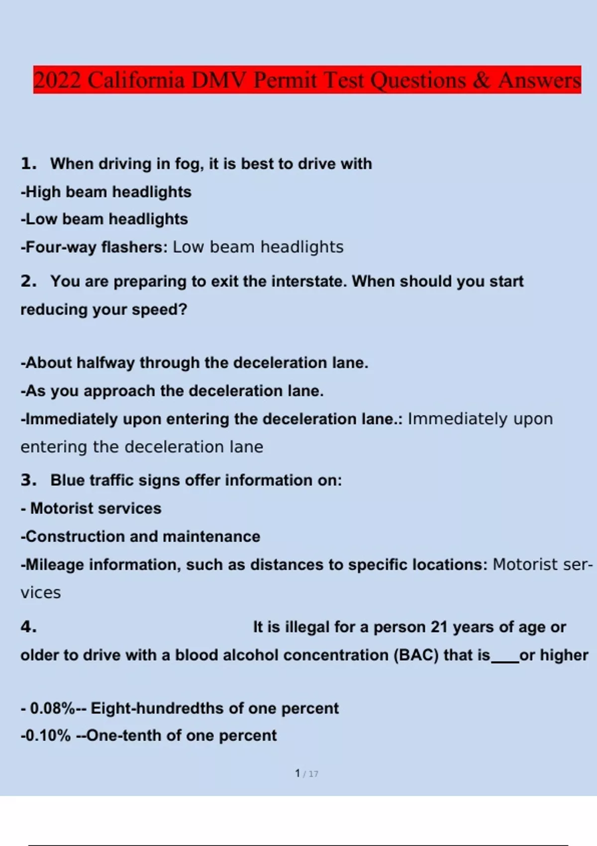 2022 California DMV Permit Test Questions and Answers |Verified Answers